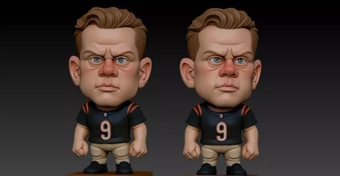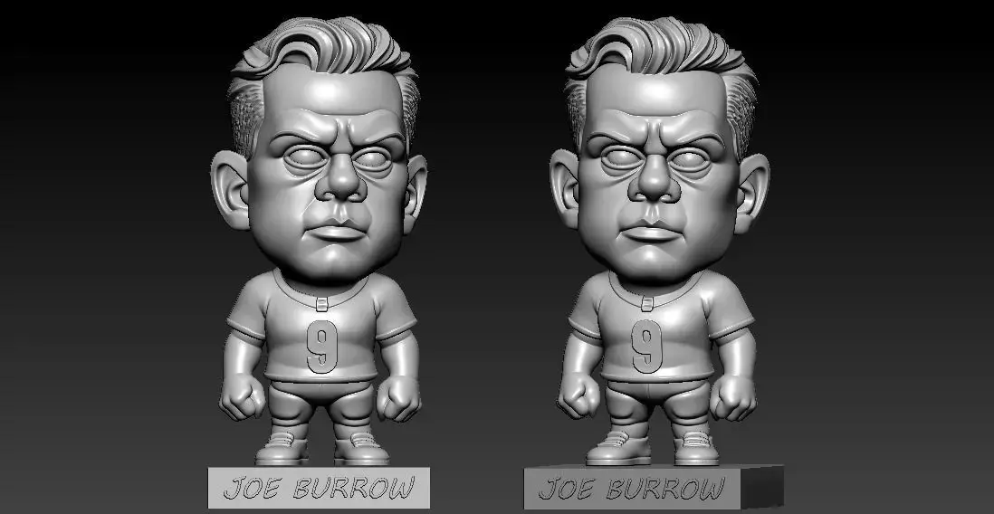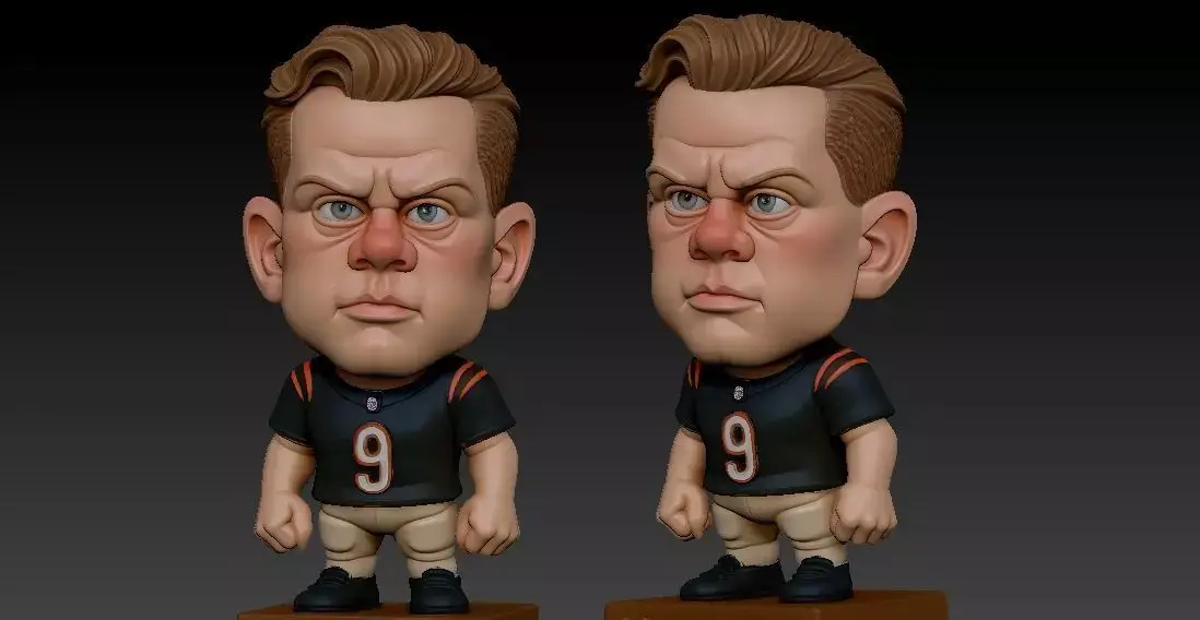 This is a unique and stylish 3D-printed caricature statue of Joe Burrow, the talented quarterback for the Cincinnati Bengals. The piece successfully captures his most prominent features, from his signature wavy hair and serious expression to his captivating blue eyes.