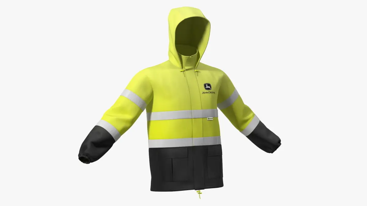 John Deere Rain Jacket High Visibility is a three-dimensional model of top part of unisex type two-piece high visibility safety rain suit which is a specifically designed protective uniform designed for outdoor workers etc.. The John Deere high visibility unisex safety rain jacket is a protective outerwear garment designed for safety during adverse weather conditions. It features bright, high-visibility colors to enhance visibility, especially in low light or rainy environments. This waterproof jacket is suitable for both men and women and provides essential protection for outdoor workers in rainy or low-visibility situations.For water protection uniform, rain safety gear, wet protective clothing, outdoor clothing, rain protective apparel, safety wear fashion styles, safety dress equipment, sport male fashion, specialized clothing, rainwear fashion, hiking wearing, and rain safety clothing accessories promotional projects.