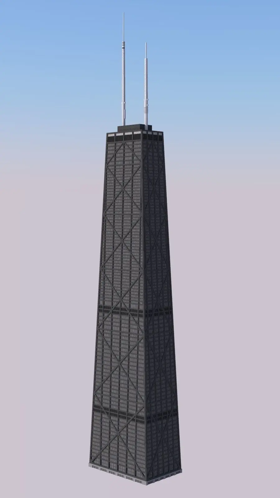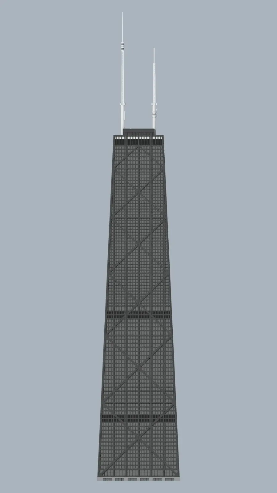 875 North Michigan Avenue, best known as the John Hancock Center, is a 1128ft (344m) tall skyscraper in Chicago, Illinois (The two radio antennae, while not counted towards the building's official height, reach further to a total height of 1500ft (457m)). Designed by world-renowned Chicago-based architecture firm Skidmore, Owings and Merrill (SOM) and engineer Fazlur Khan, the building was completed in 1969. It's unique tapering trapezoidal massing, characteristic steel X-bracing, stark black color, and towering height made it an instant icon of the city.Located near the Northern end of Michigan Avenue, the tower stands as a bookend to Chicago's mighty skyline.Upon it's completion, it was 2nd tallest building in the world, behind only New York City's Empire State Building. It was also the second building ever constructed to have 100 floors. Today, it is only the 5th tallest in the city, yet it remains one of the most recognizable and most cherished.