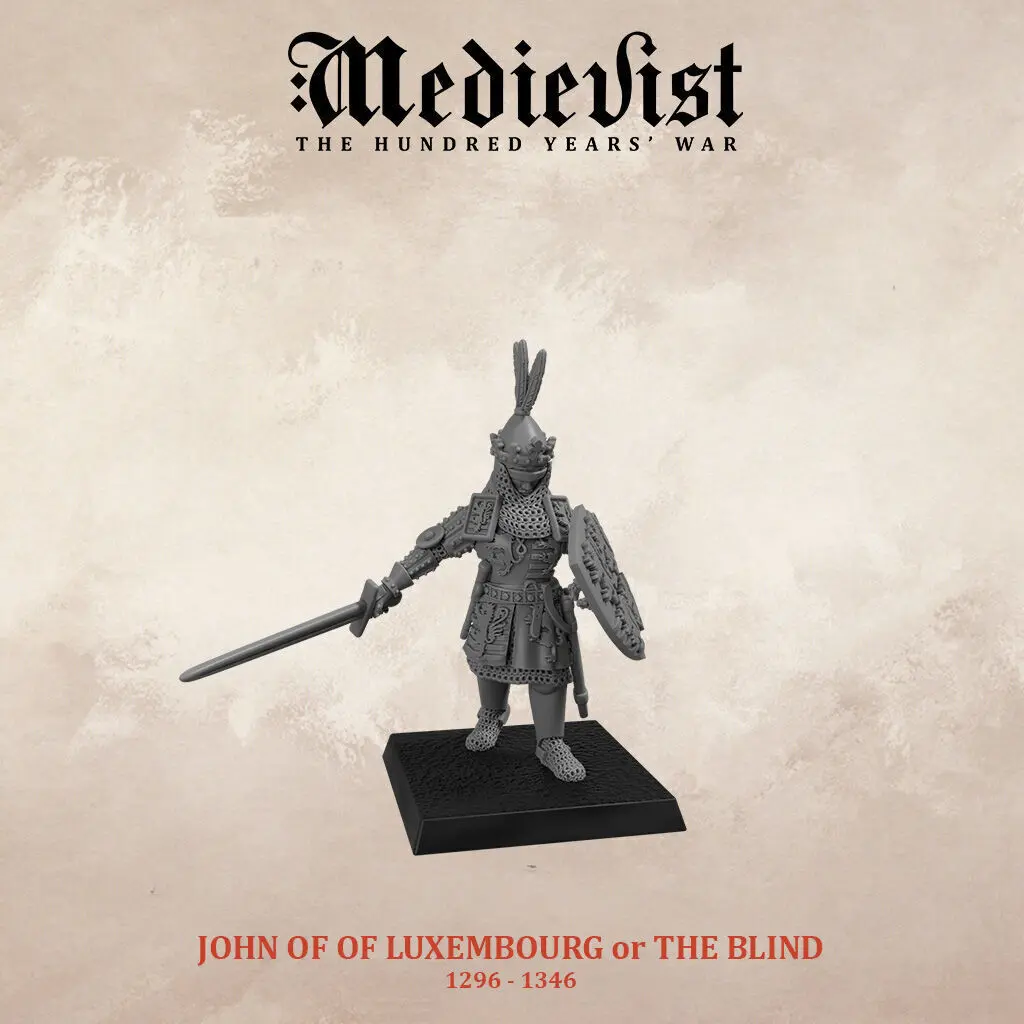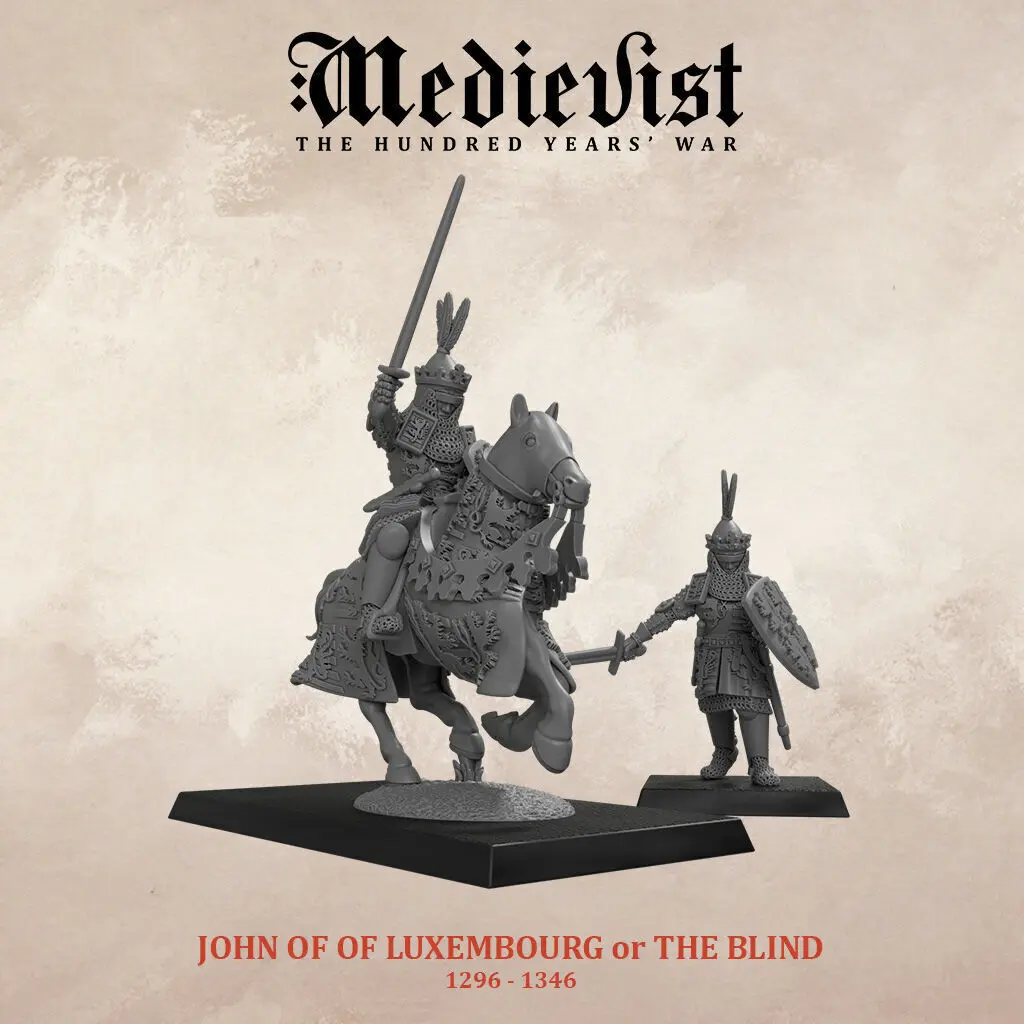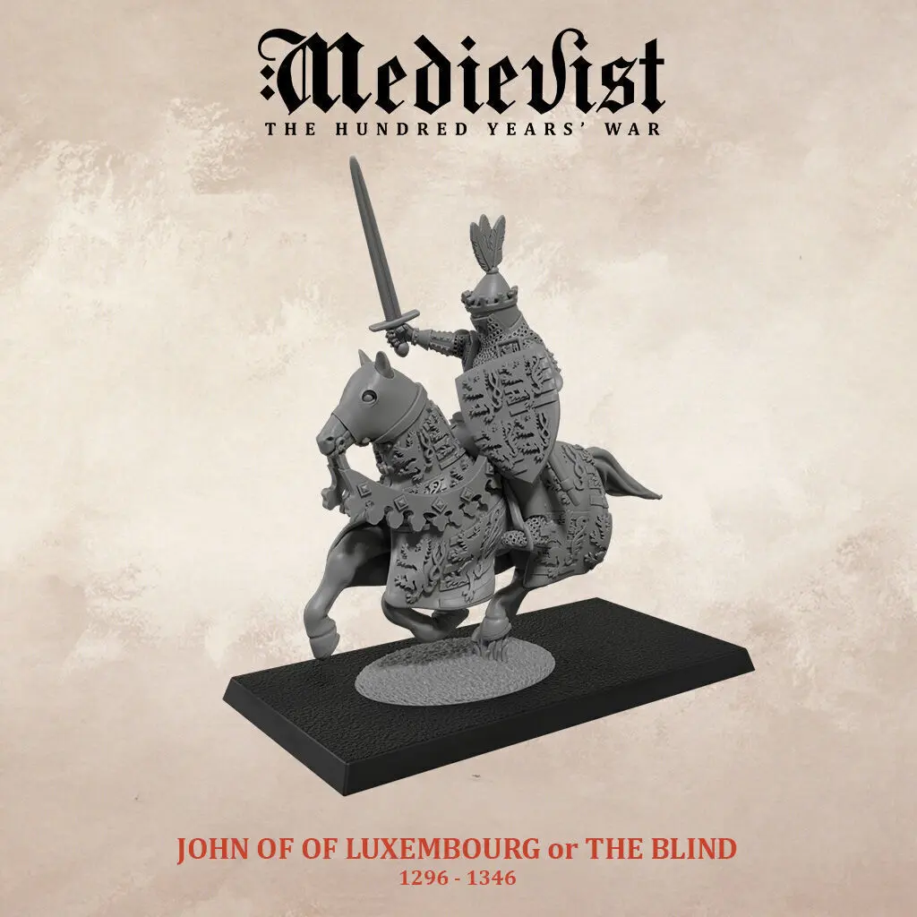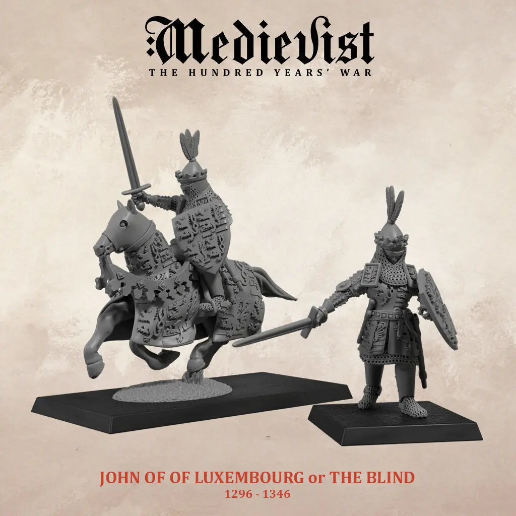 John of Luxembourg, King of Bohemia and Count of Luxembourg depicted on foot, mounted and with an optional shield.