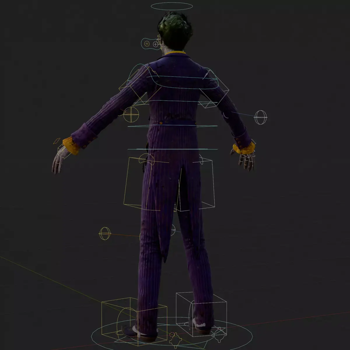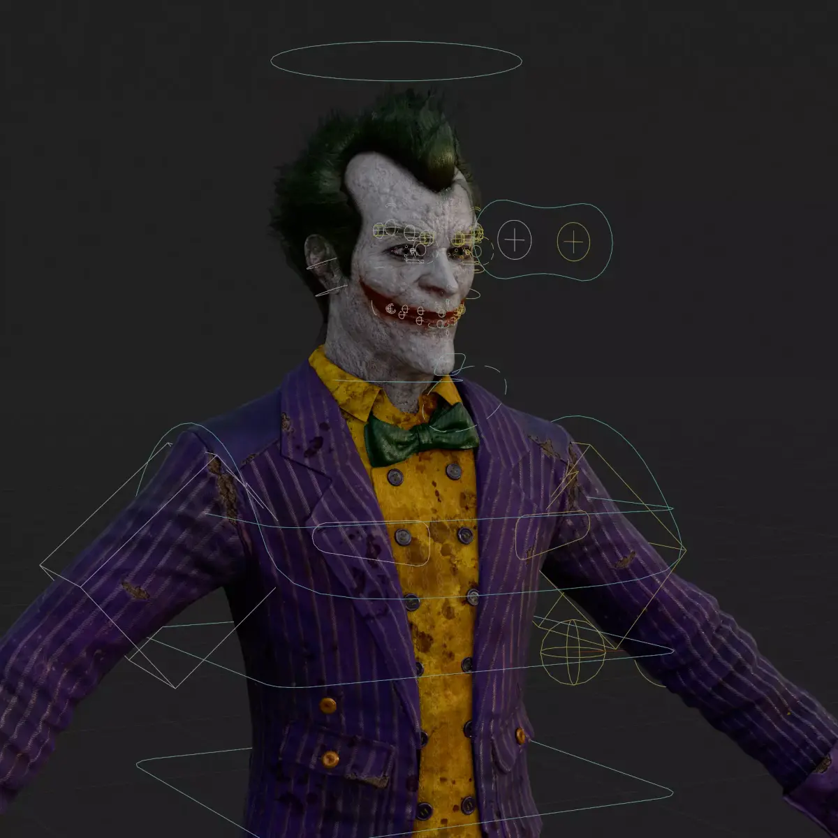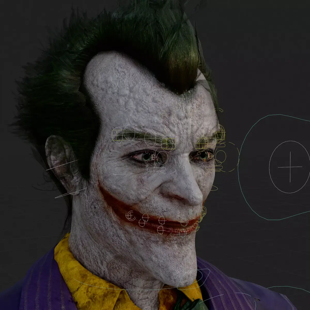 This high-quality 3D model of the Joker, inspired by his appearance in Batman: Arkham Knight, is fully rigged and stylized for animation, game development, and cinematic rendering. The model features detailed textures, exaggerated comic-style proportions, and clean topology, making it ideal for real-time use or stylized visual storytelling.
