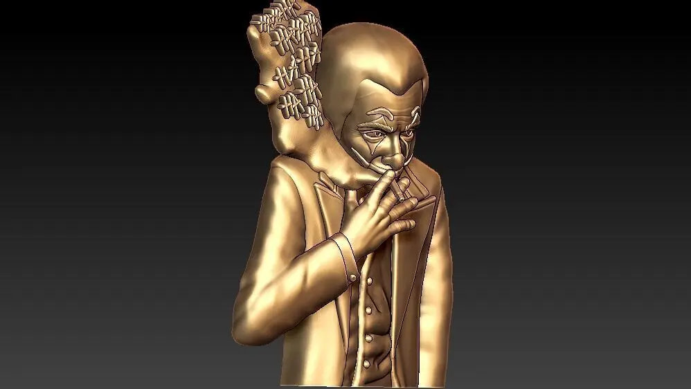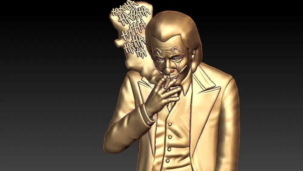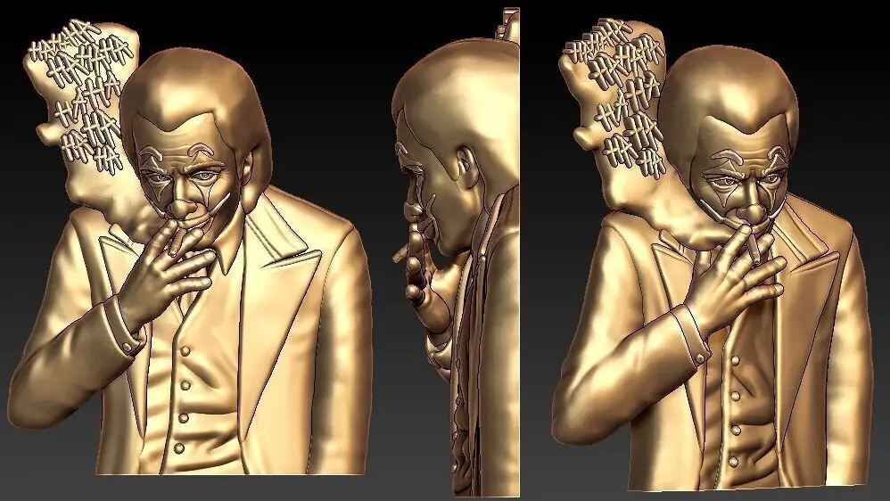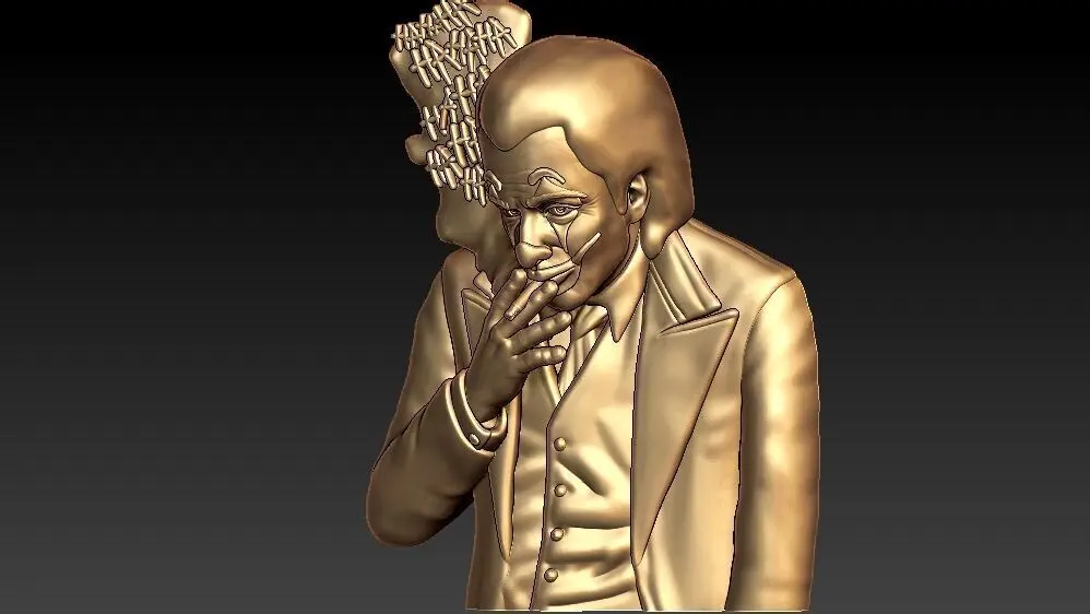 This high-detail 3D relief model features a dark and intense depiction of the Joker character smoking, crafted with expressive emotion and character. The model captures a cinematic and dramatic pose, complete with stylized smoke and tally marks, making it an excellent centerpiece for jewelry design, engraving work, or collectible items.