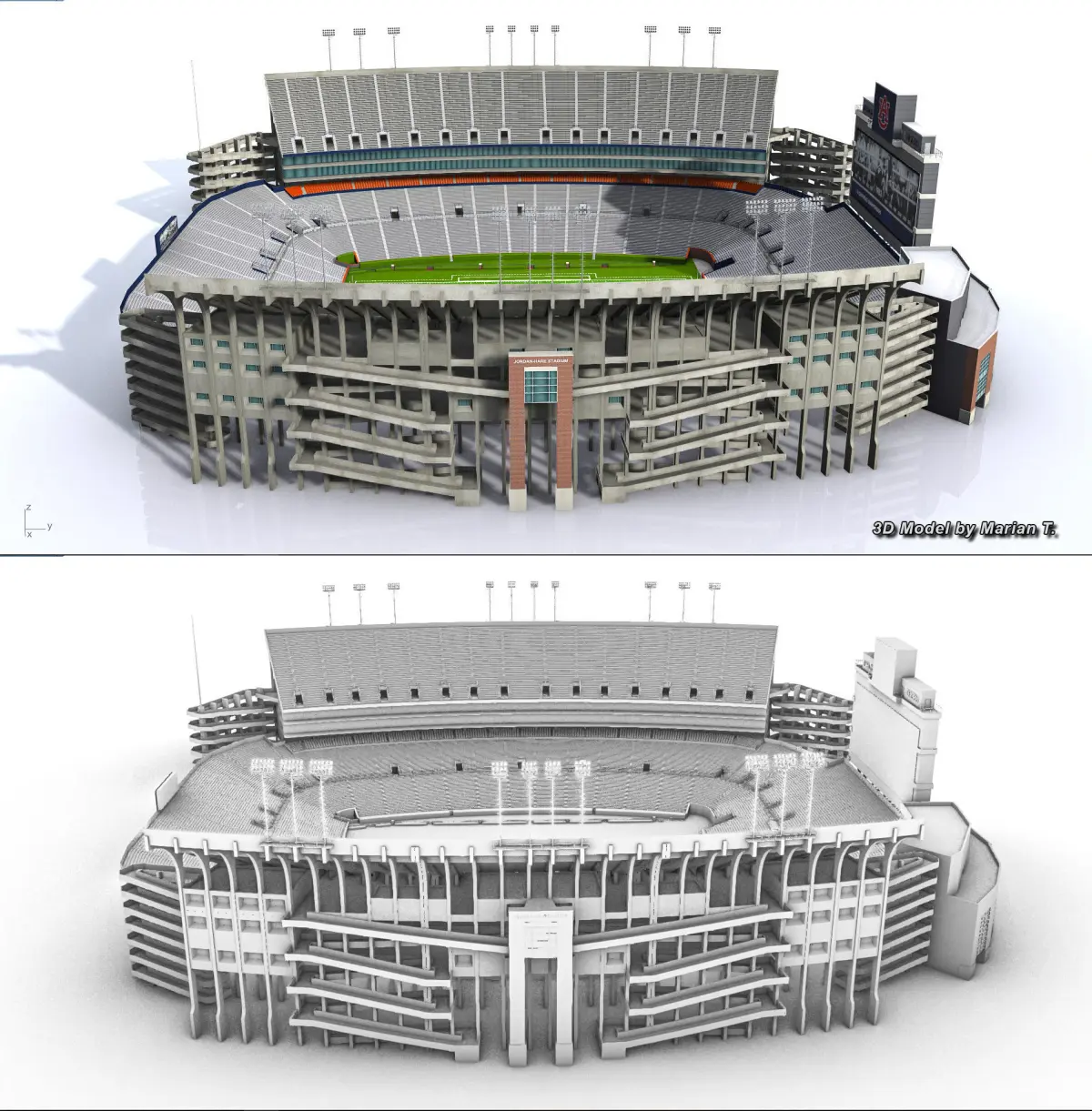 The 3D model is based on photos references of the real world Jordan-Hare Stadium, both, interior and exterior. It was created with approximate dimensions.