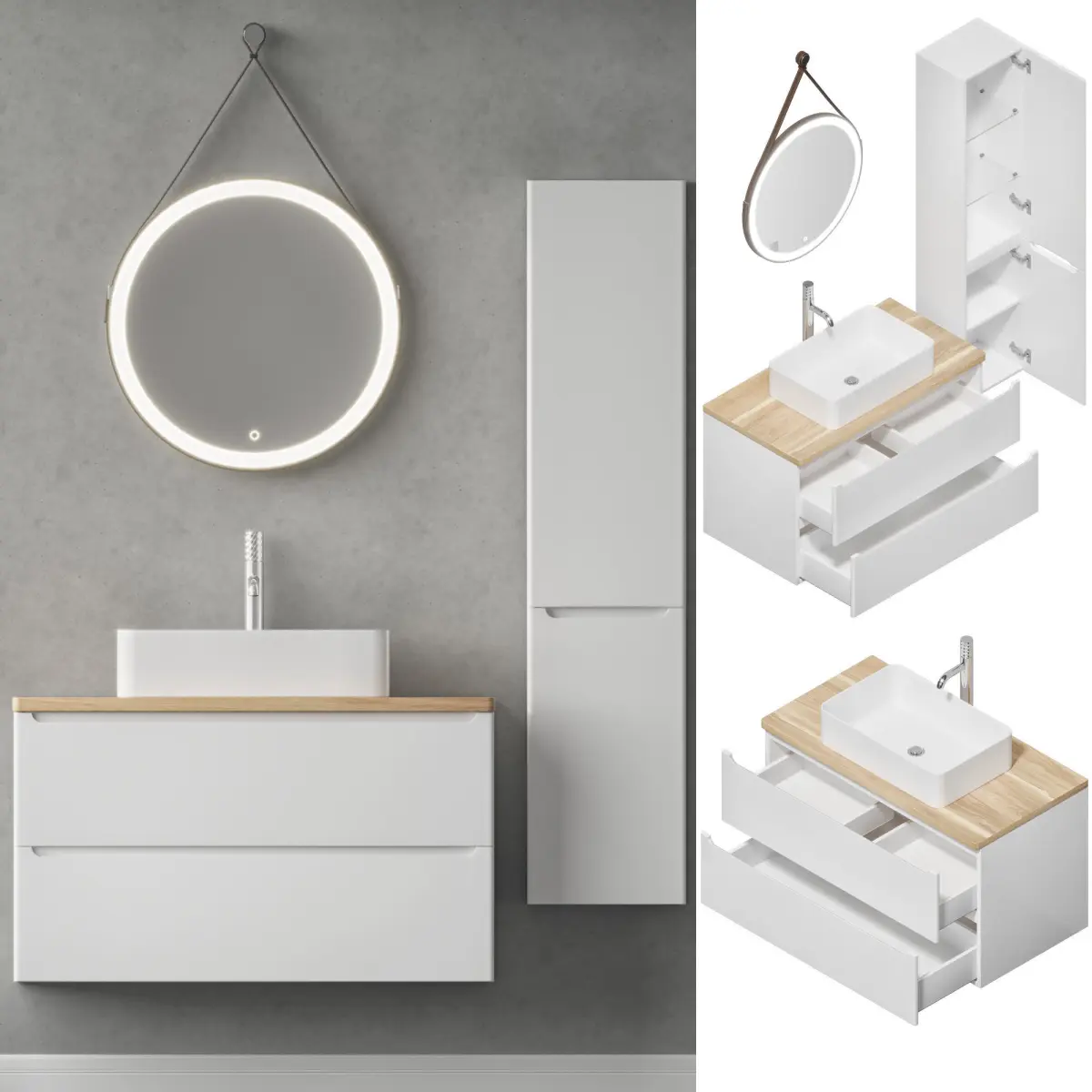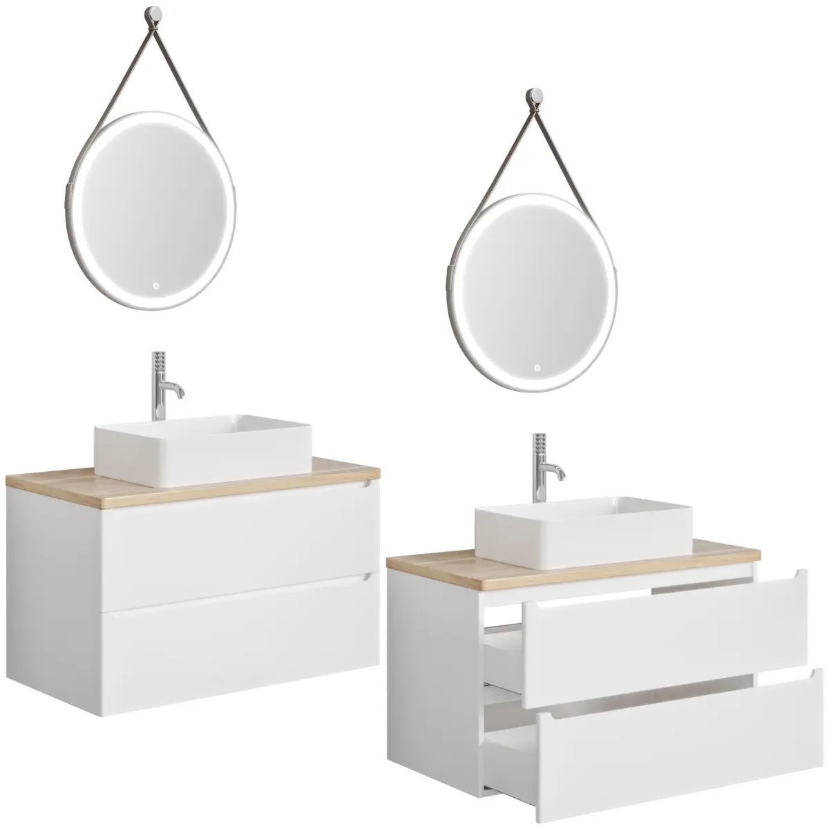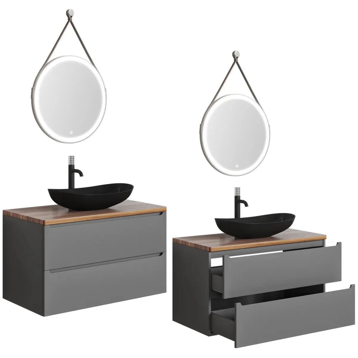 This collection is designed for those who value the blend of functionality and aesthetic appeal. The series features easy-to-access drawers and storage doors, ensuring convenience alongside style. The unique brown leather belt mirror and the choice of mixers in matt black or chrome finish further complement the modern design.Included in the Archive
