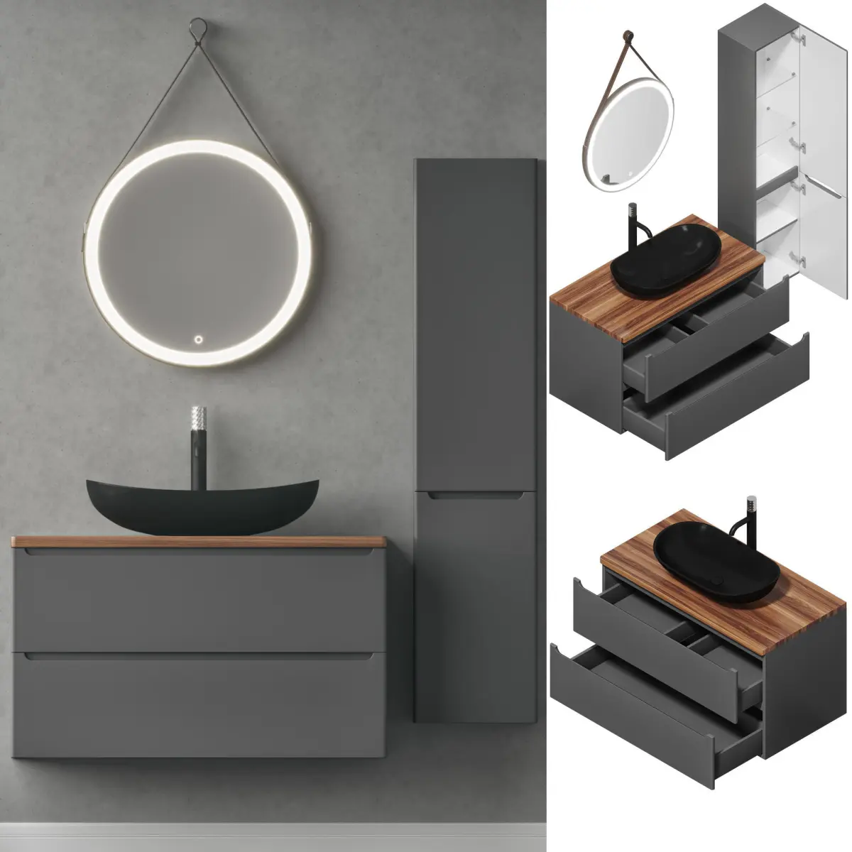 The Jorno Wood 100 series masterfully combines modern design with natural elements. This sophisticated selection of bathroom furniture features a sleek white gloss and anthracite finish, beautifully accented by light and dark wood.Cabinet