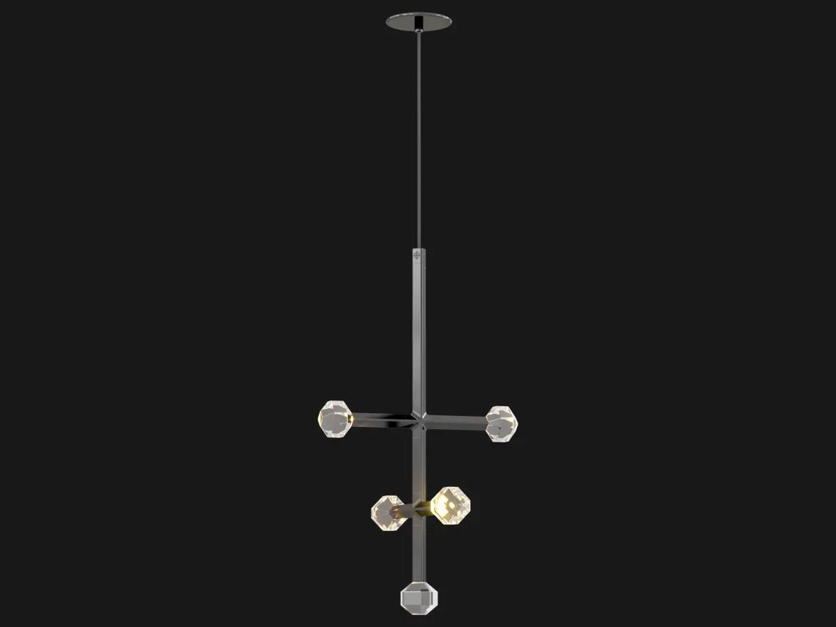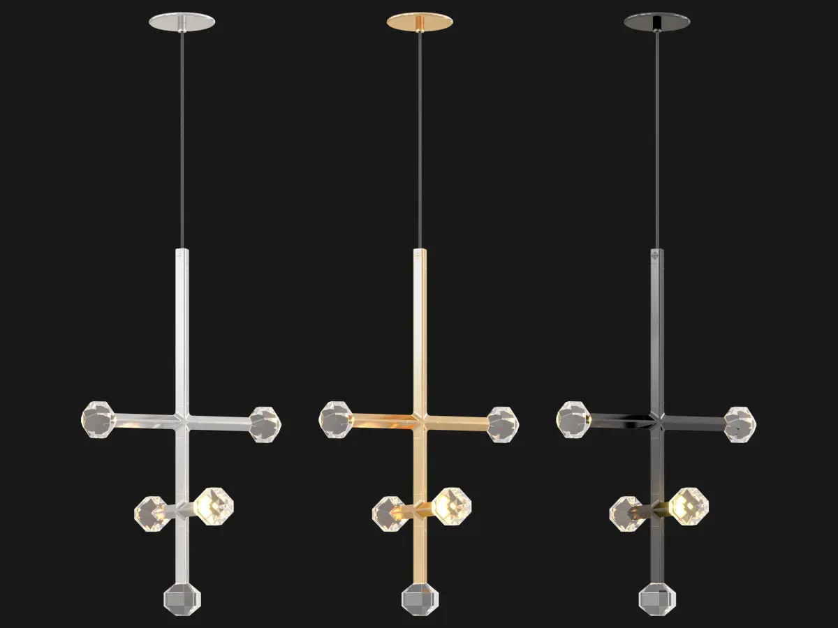 Joulle reimagines the classic crystal chandelier as a network of un-mined earthen stones. A quiet bevel traces both ore and light, contouring the machined aluminum body and the hand-polished cut crystal light source. The resulting form is reminiscent of the gems historically found at the bottom of chandelier silhouettes… and within fabled troves. Comprised of modular elements that quickly lock together, Joulle becomes a never-ending network of sculptural ceiling and wall fixtures.