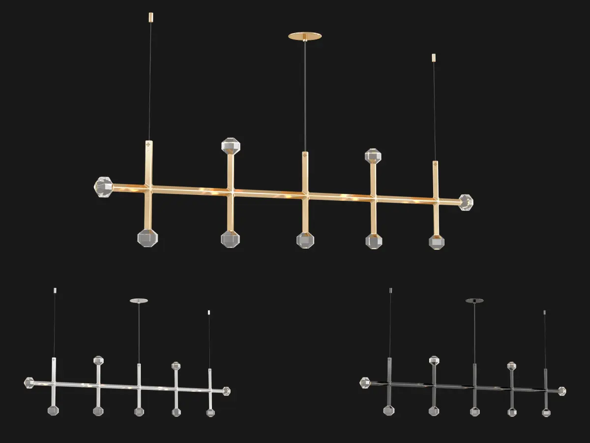 Joulle reimagines the classic crystal chandelier as a network of un-mined earthen stones. A quiet bevel traces both ore and light, contouring the machined aluminum body and the hand-polished cut crystal light source. The resulting form is reminiscent of the gems historically found at the bottom of chandelier silhouettes… and within fabled troves. Comprised of modular elements that quickly lock together, Joulle becomes a never-ending network of sculptural ceiling and wall fixtures.