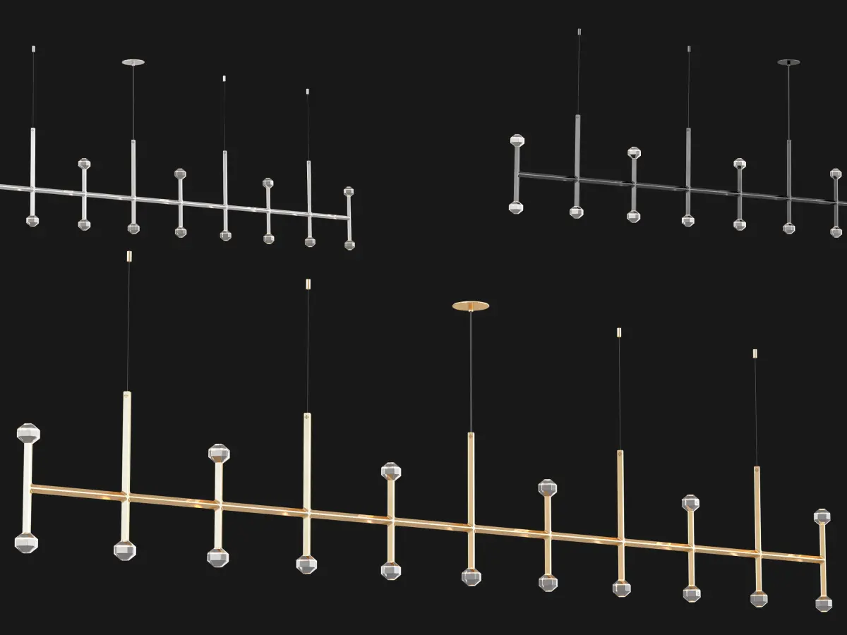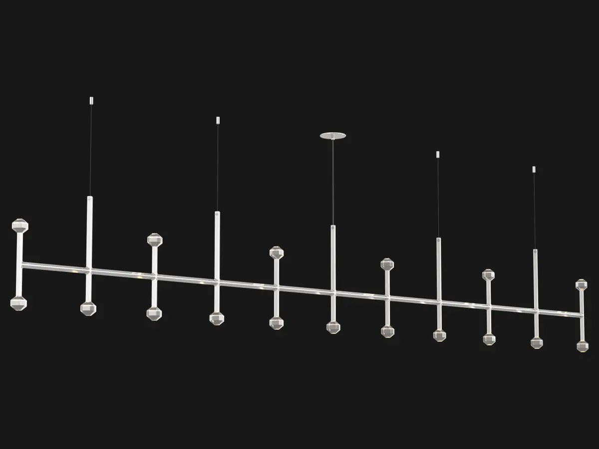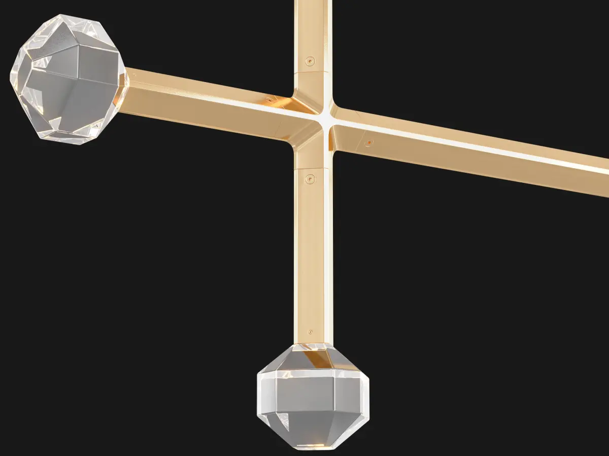 Joulle reimagines the classic crystal chandelier as a network of un-mined earthen stones. A quiet bevel traces both ore and light, contouring the machined aluminum body and the hand-polished cut crystal light source. The resulting form is reminiscent of the gems historically found at the bottom of chandelier silhouettes… and within fabled troves. Comprised of modular elements that quickly lock together, Joulle becomes a never-ending network of sculptural ceiling and wall fixtures.