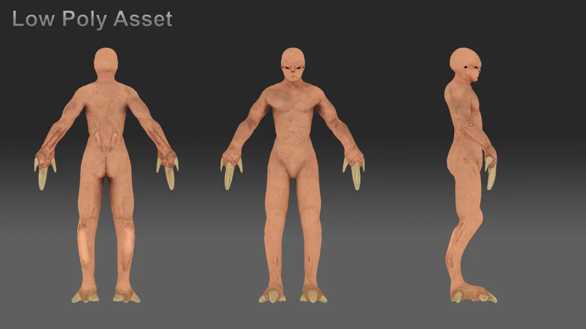 This contains a rigged, game ready low poly model with a high poly and level of detail version of the model. The model comes with its own textures in various formats and resolutions.