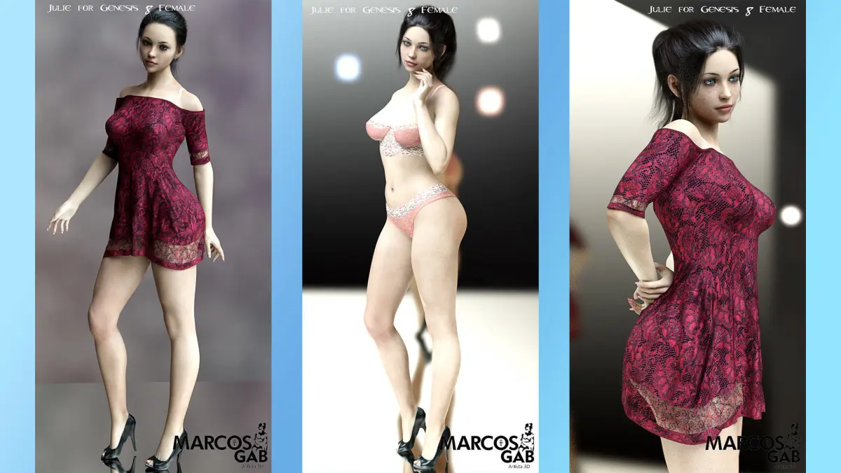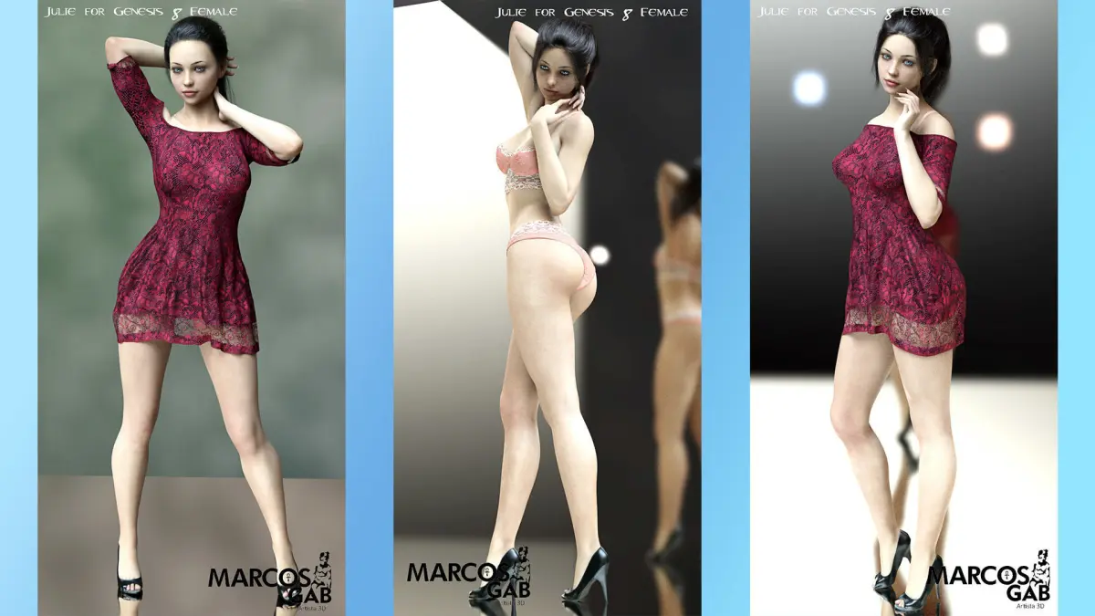 This is Julie for Genesis 8 Female, this is a beautiful woman created by me and my wife. It was made using Hexagon 2.5 and Zbrush.She is a beautiful woman and I hope you enjoy to create your art with her.