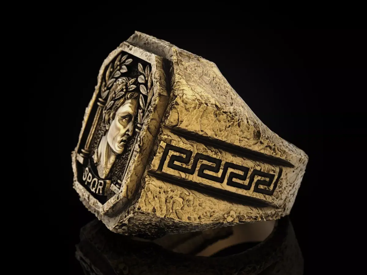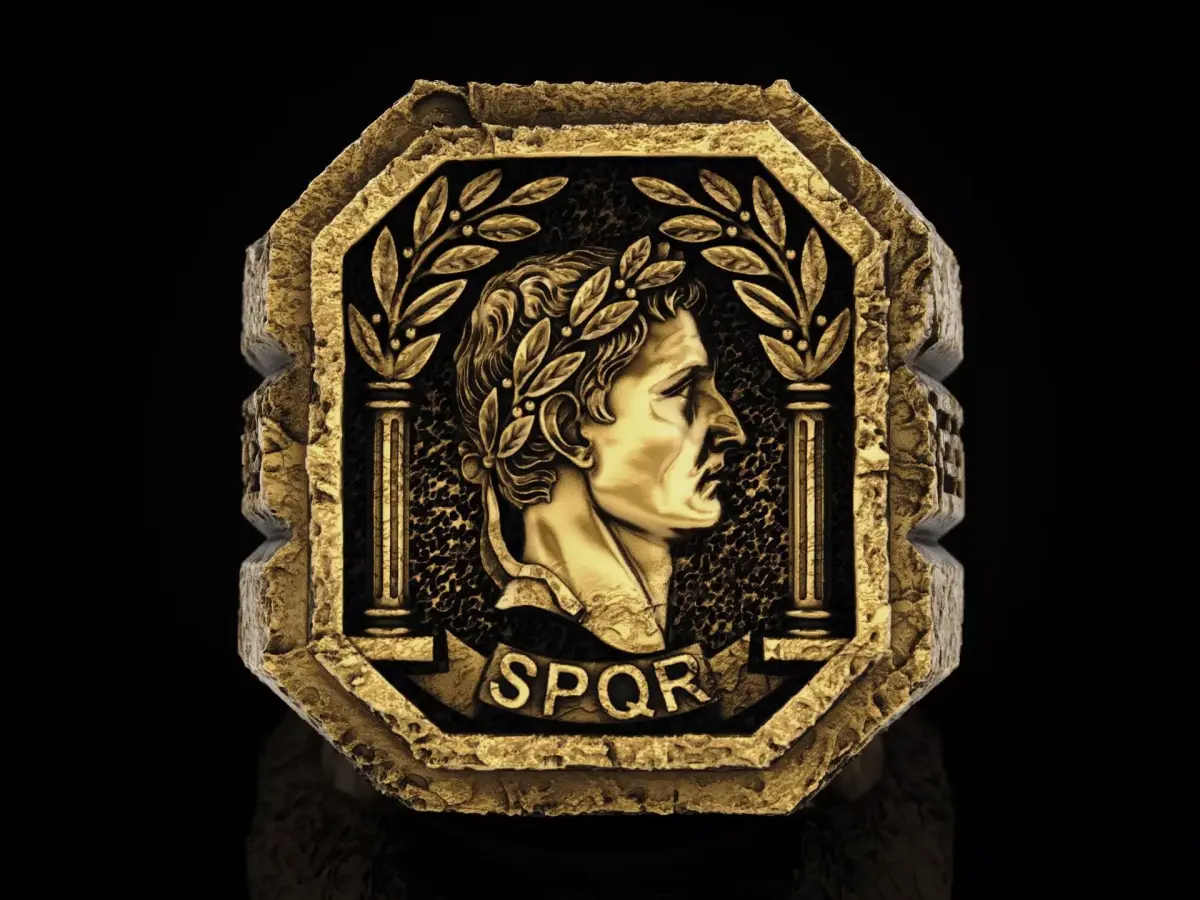This exceptional 3D model belongs to the Ruinism series, depicting a weathered portrait of Julius Caesar. The design features classic Roman symbols including the laurel wreath, SPQR inscription, and traditional columns, all encased in a signature eroded stone-like texture. Side shanks are decorated with a bold Greek meander pattern, creating a powerful historical relic aesthetic.