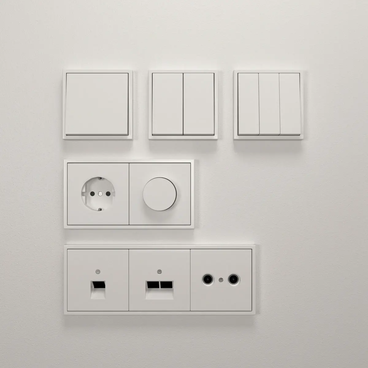 Jung - LS 990 flat switches include: Jung - LS 969-1 UA WW, Jung - LS 969-2 UA WW, Jung - LS 981 WW - Frame 1-gang, Jung - LS 982 WW - Frame 2-gang, Jung - LS 983 WW - Frame 3-gang, Jung - LS 990 - TV, Jung - LS 990 WW - Rocker 1-gang, Jung - LS 993 BF WW - Rocker 3-gang, Jung - LS 995 WW - Rocker 2-gang, Jung - LS 1520 WW - Schuco socket, Jung - LS 1940 WW - Dimmer.