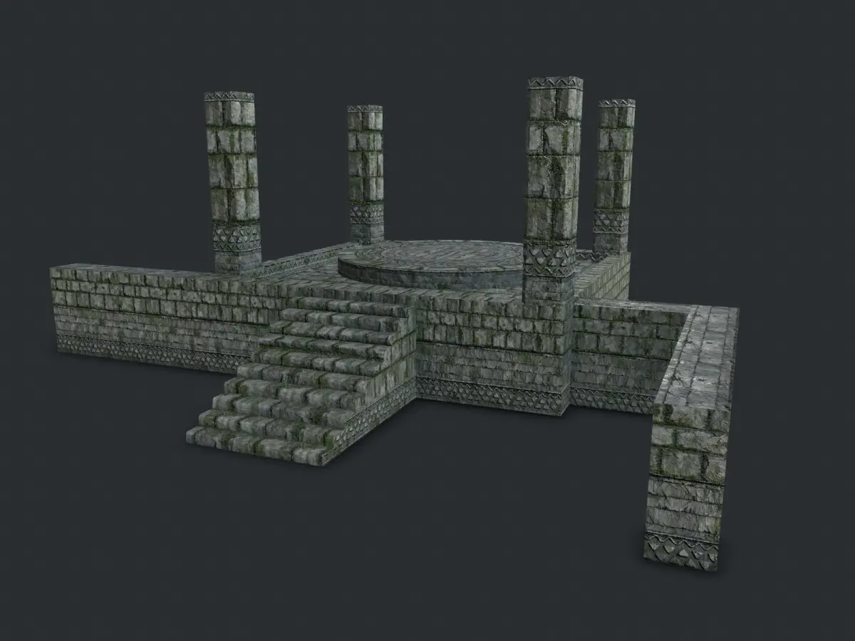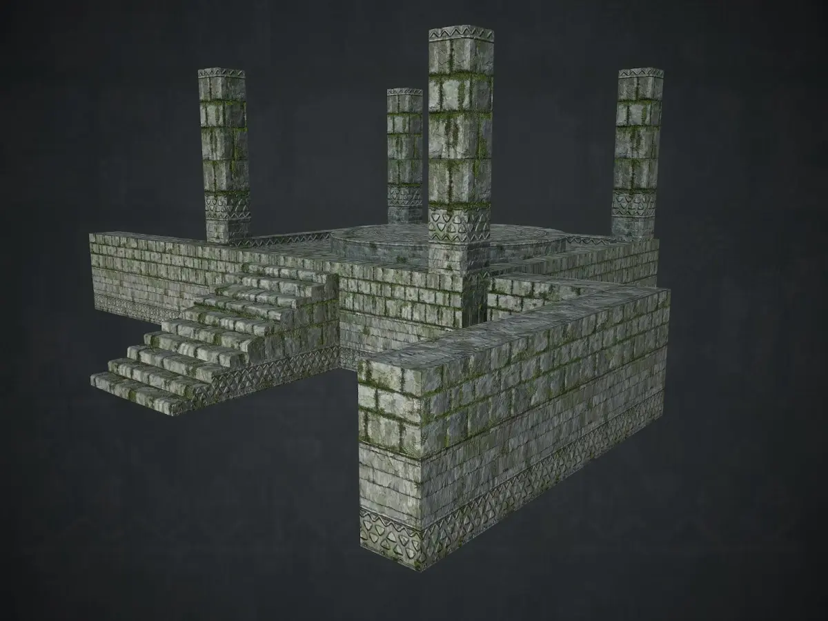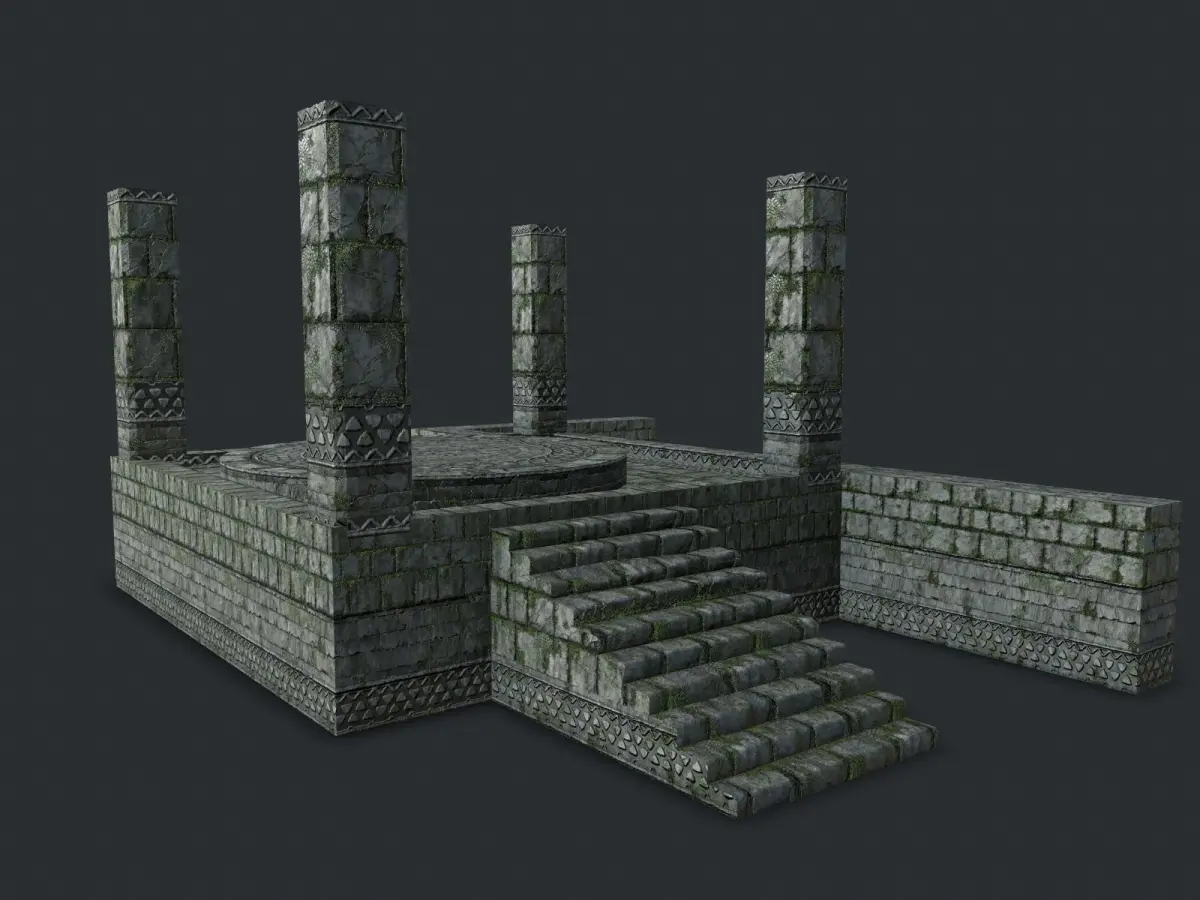 Six unique meshes:altar_wall (28 tris)altar_pillar (92 tris)altar_stairs (275 tris)altar_ring (224 tris)altar (272tris)floor (32 tris)