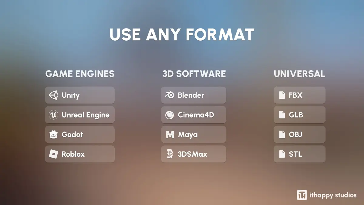 FILESYou’ll be able to download formats such as Unity Package, UE, Blender, C4D, Maya, 3DSMax, FBX, OBJ, GLTF, and STL.