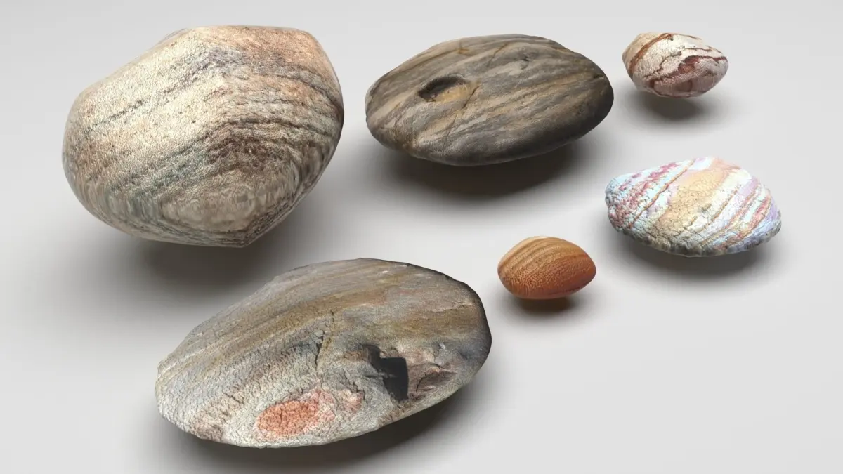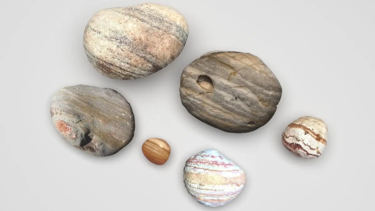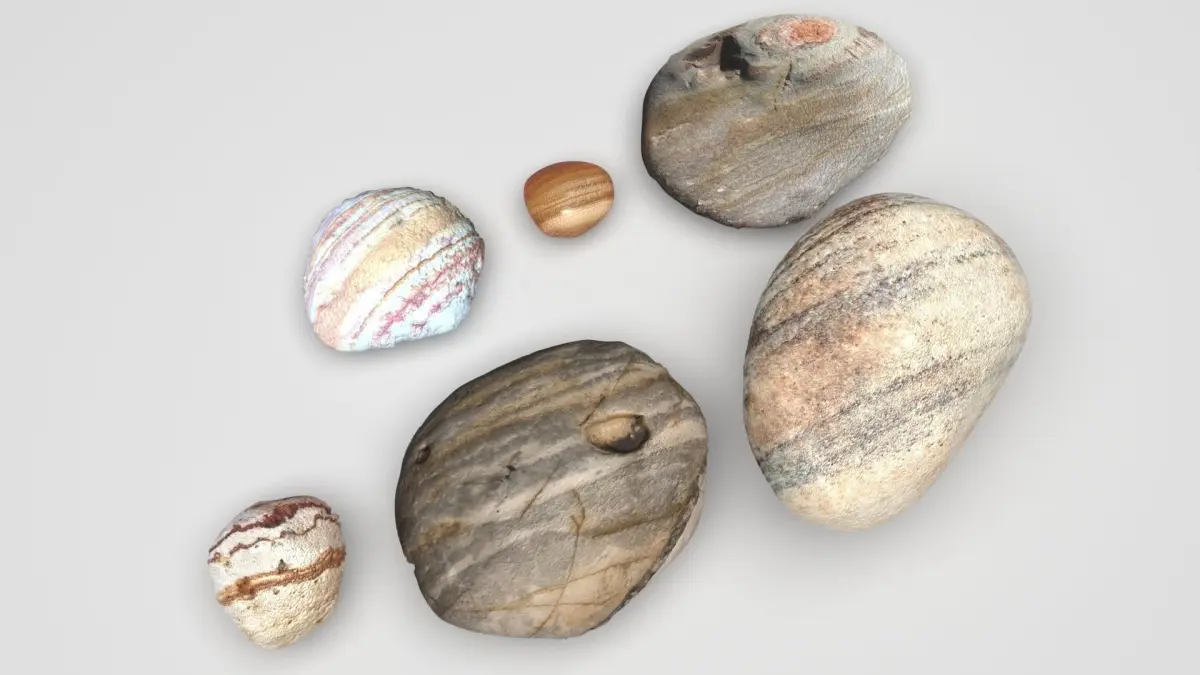 6 different pebbles models with textures, copied from real sea pebble. Separate texture set for each model.