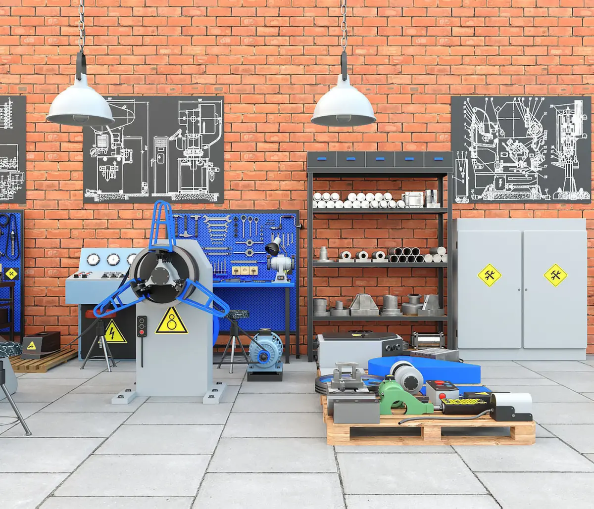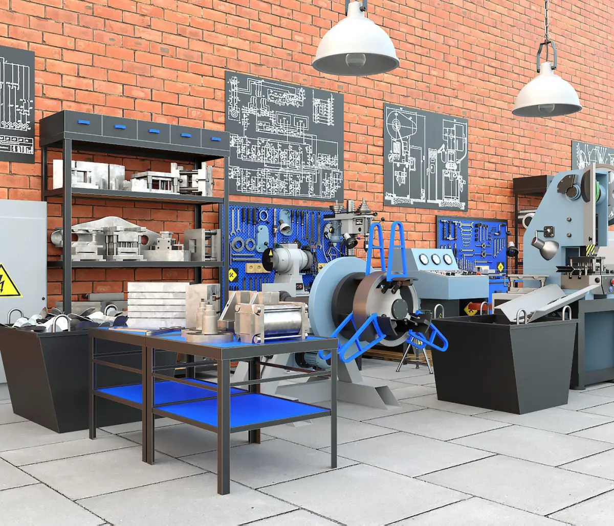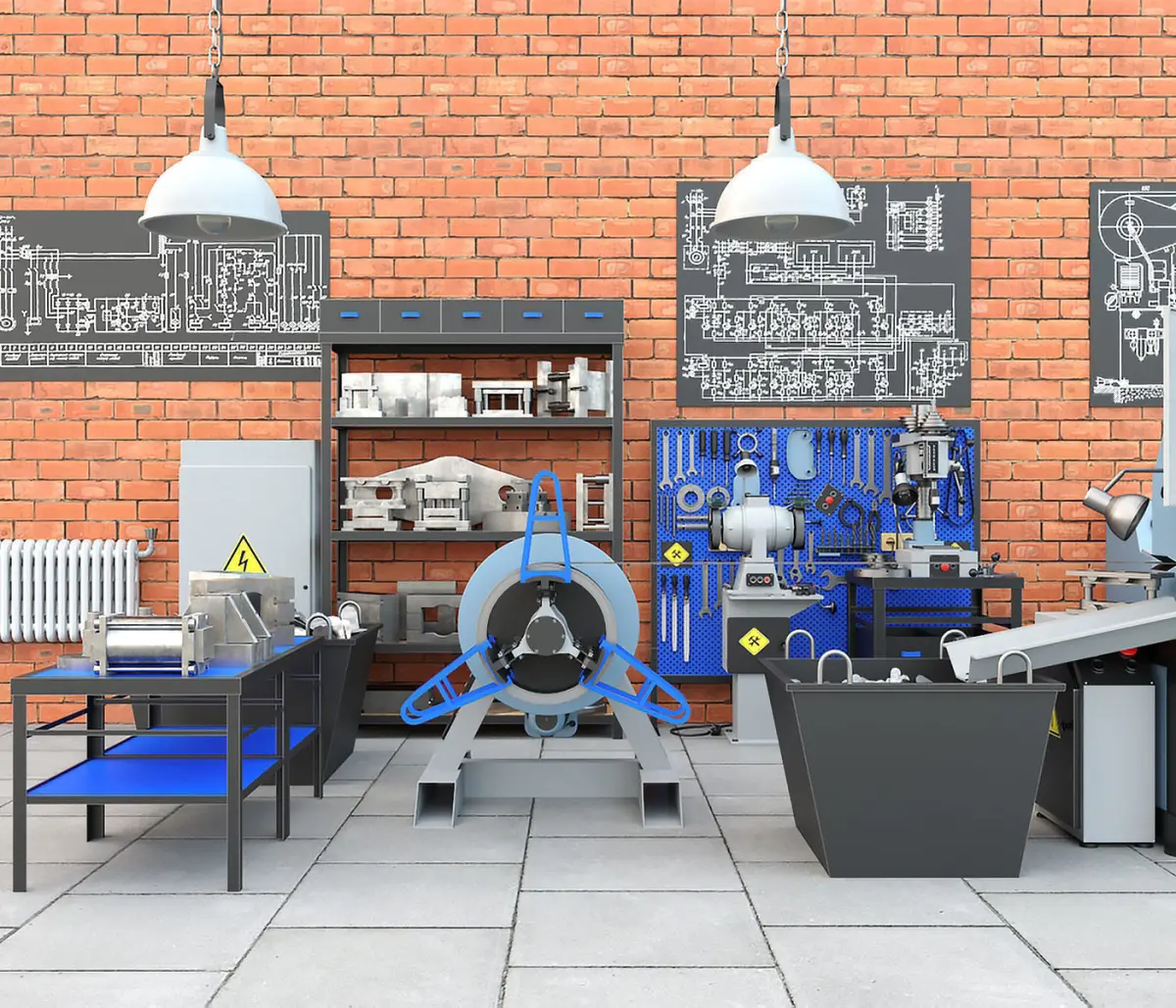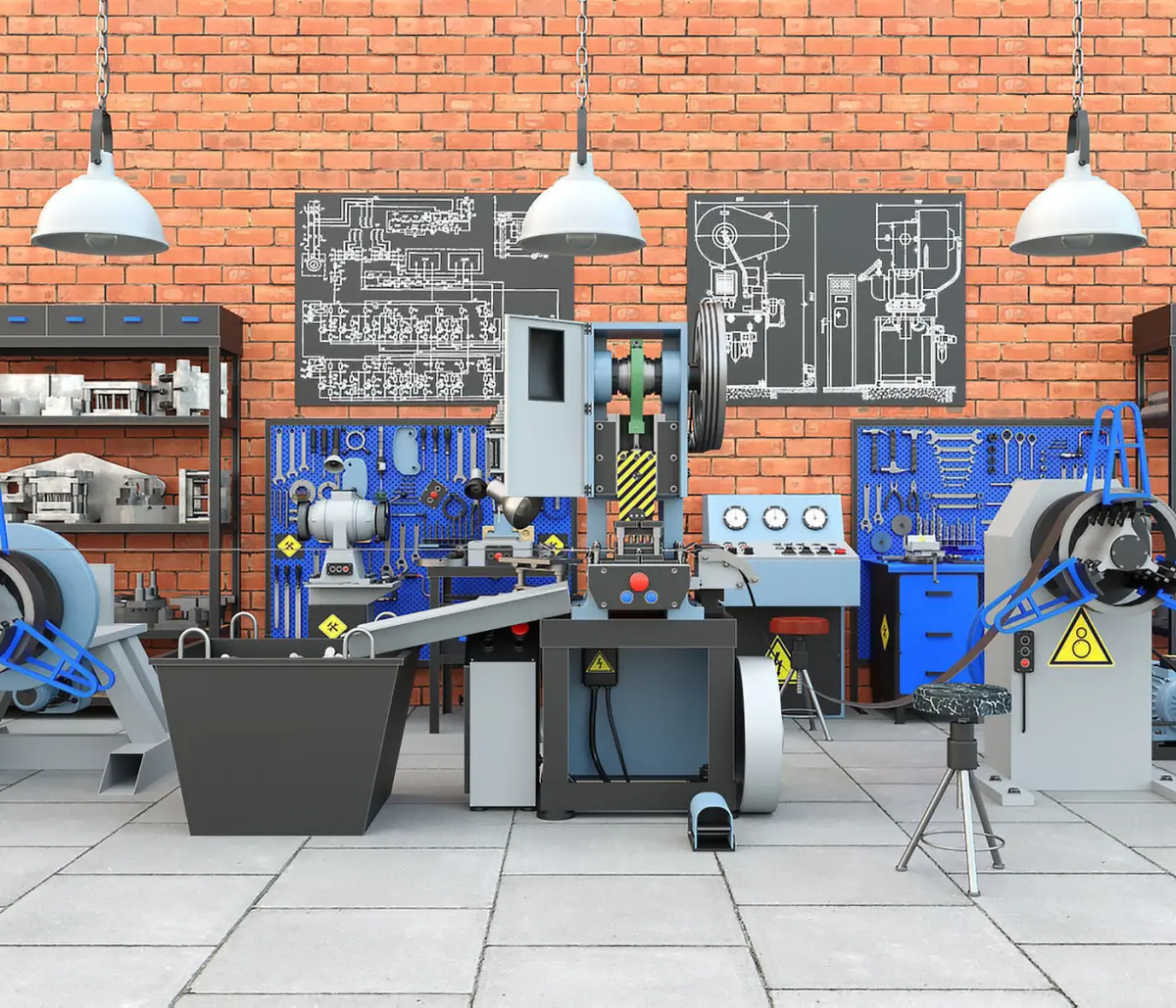 The third and most expanded industrial collection of mechanical presses created in our studio, including a detailed environment. This time we offer to purchase a collection based on a production stamping line that was recreated on the basis of a mechanical press model K2118B. The line includes an unwinding device, a feeding device, a metal tape, a stamp for working on the press, a receiving device, a control bullet and, of course, the mechanical press itself. Also, this collection consists of a large number of detailed elements. Note that all the details of the 3d models were implemented with a very high degree of elaboration, which will characterize the most realistic presentation in the projects. The following industrial elements are also presented in the collection in a detailed way: an electric cabinet and a cabinet of tools, ceiling lamps, a workbench with a variety of tools, including garage tools. On the workbench there is an emery or a grinding machine, pliers, hammers, files, various wrenches, vises, sockets, a lamp, a hand drill and other tools. The second workbench already has tools different from the first version, where there is also a desktop drilling machine model 2M112 and a large grinding machine for metal processing. A rack with molds, press parts located on wooden pallets, chairs, a table, a container with metal waste obtained during the stamping process, and even images of electrical circuits in the form of paintings on the walls. In addition, not only materials are presented here, but also a fairly wide range of various textures in different resolutions, which will certainly give the models an even more lively and realistic look. Note that there is also the texture of brickwork on the walls, and the texture of concrete slabs on the floor. These well-developed textures can be used in other industrial projects, applying them to walls and floors easily and quickly. The collection will be an excellent tool for integration into any industrial project, eliminating the need to model a variety of objects for industry. And in the general presentation, the industrial collection looks very interesting, promising and of course high-quality! We highly recommend you to purchase the presented 3d model!