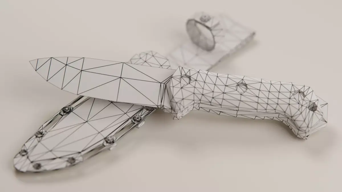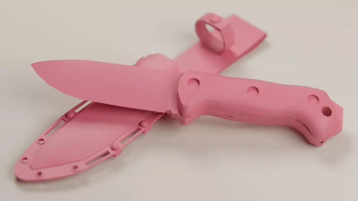 A lowpoly Ka-Bar BK-2 hunting knife with a polymer grip and a polymer sheath.