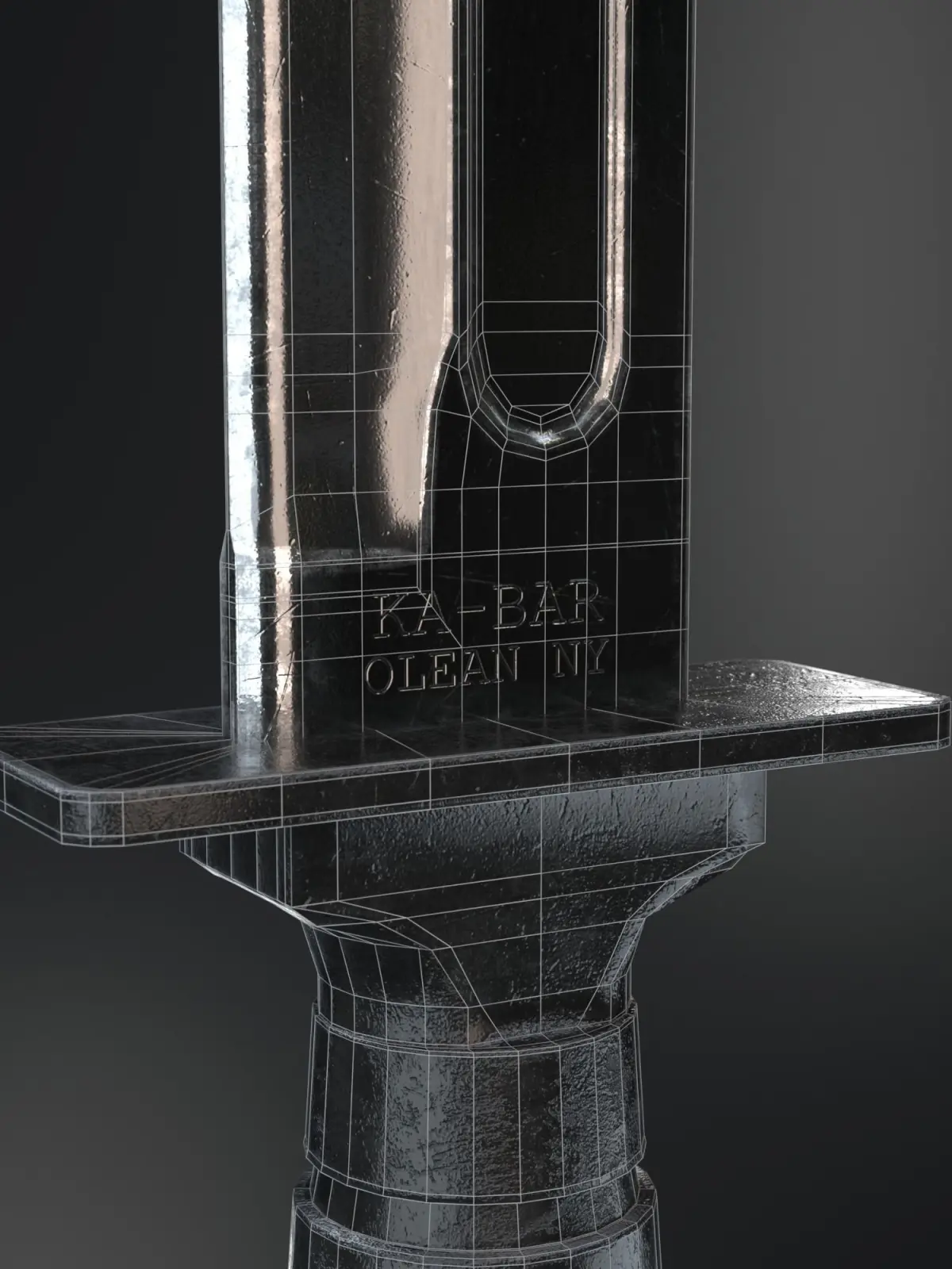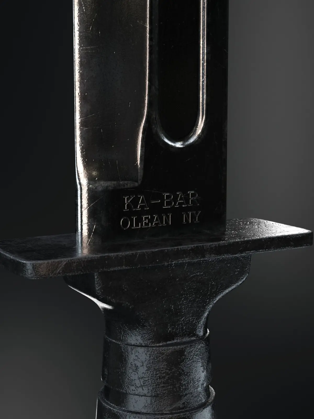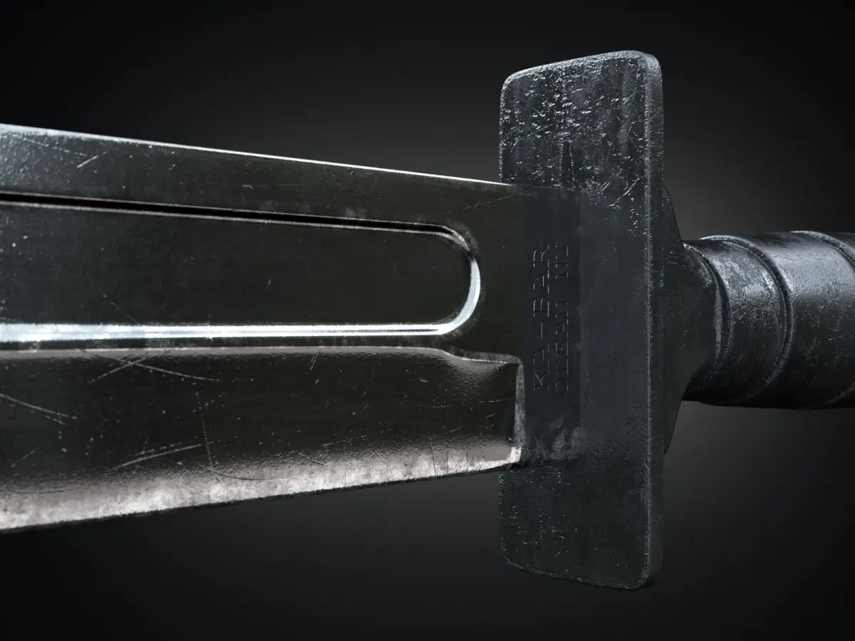 The model above is a close representation of a KA-BAR knife. I decided to change the look of the handle a bit (honestly that was because I had a bad reference image and I realized at the end it was not the generic shape). It was widely used by US military forces and marines. It is a great tool for cutting through flesh, for opening cans, capable of dealing massive bleeding. The model is made so that it has been quite a lot of time, you can see the blade is worn and the handle is scratched.