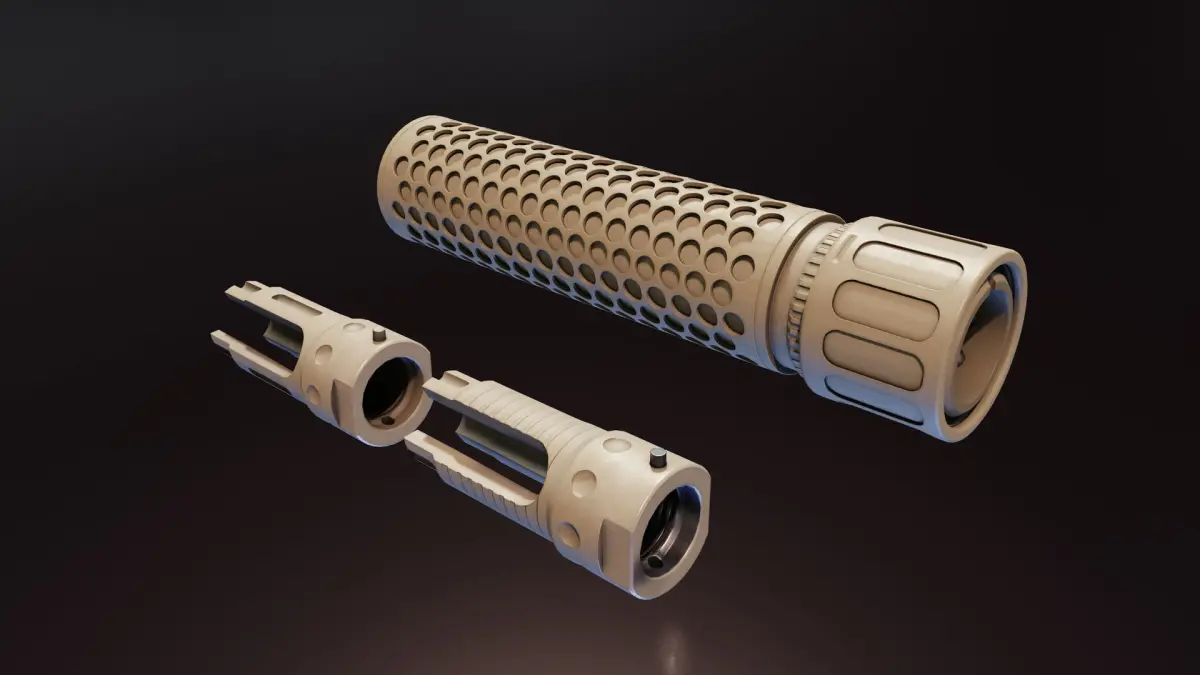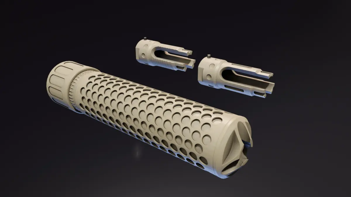 5.56mm QDC 3-Prong Muzzle device and sound suppressor.