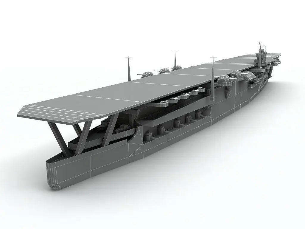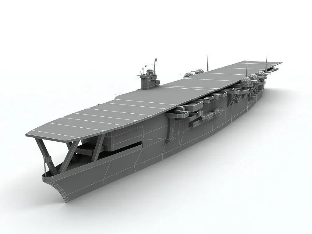 Kaga Aircraft Carrier Ship WWII - (Low Detail - Complete UVW mapping and linking, no textures.)This model was designed to scale from technical drawings for a simulator, video game, or live 3D application. Although all the major dimensions are correct (length, height, width, etc.) every exact arc and measurement was not taken into account for engineering purposes. This model is best suited for entertainment and multimedia.