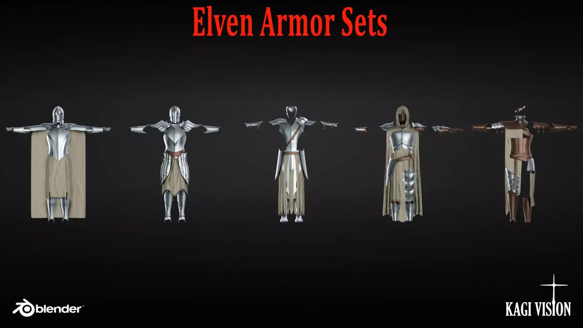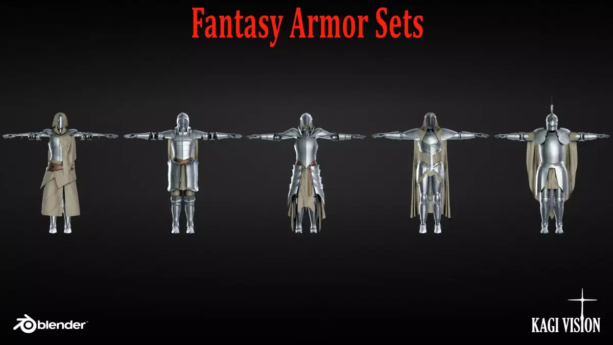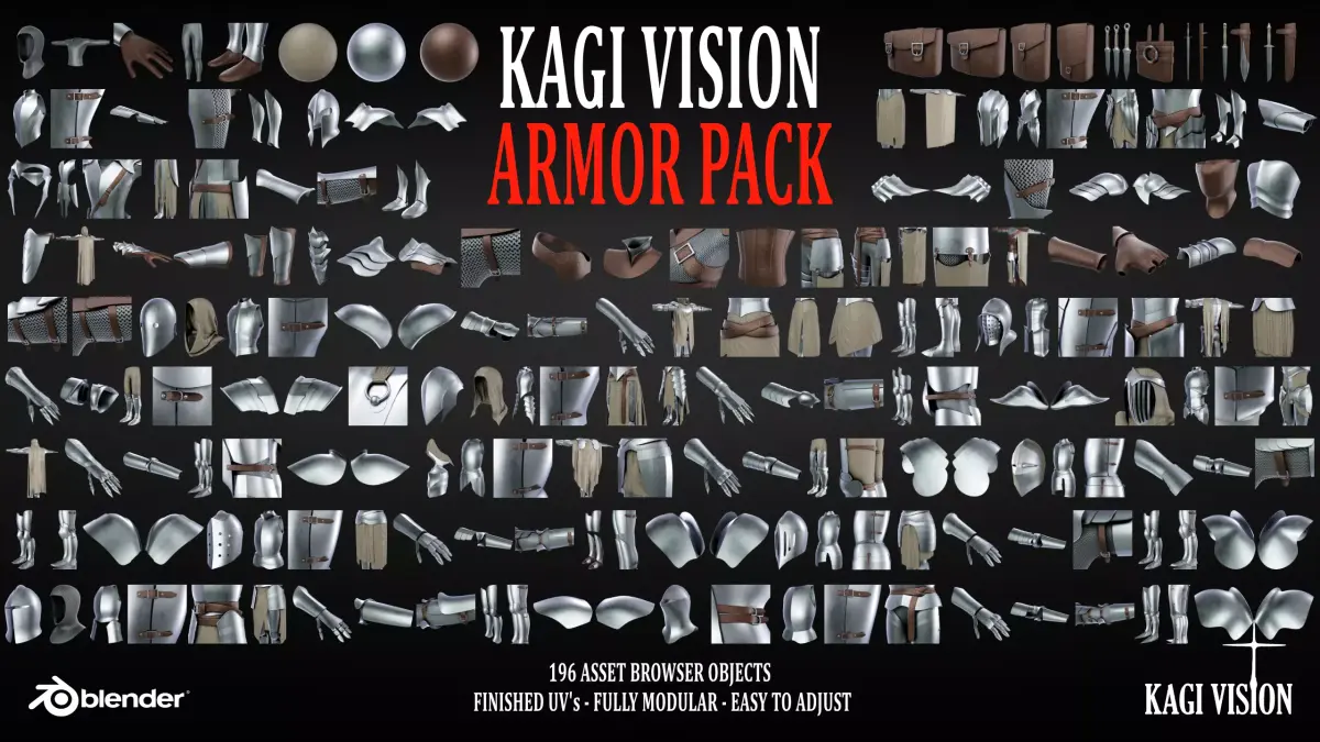 Kagi Vision Armor PackWant to create armor models quickly and efficiently? Our Blender asset pack can help! With 15 complete armor sets and 196 total assets, you'll have everything you need for your Game, Art, Concepting, or any other 3D project. Try the free demo version to check out the quality of these assets first!Highlights:196 carefully crafted armor assets15 complete armor sets across three categories: Elven, Fantasy, and Medieval