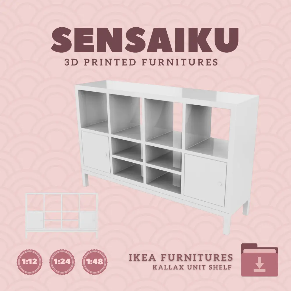 Designed by Sensaiku, a miniature furniture shop specializing in 3D print files, this model replicates the simplicity and modular design of the original KALLAX unit. Optimized for easy 3D printing, it ensures high-quality, detailed results across all scales, making it an ideal addition to dollhouses, dioramas, or scale model projects.