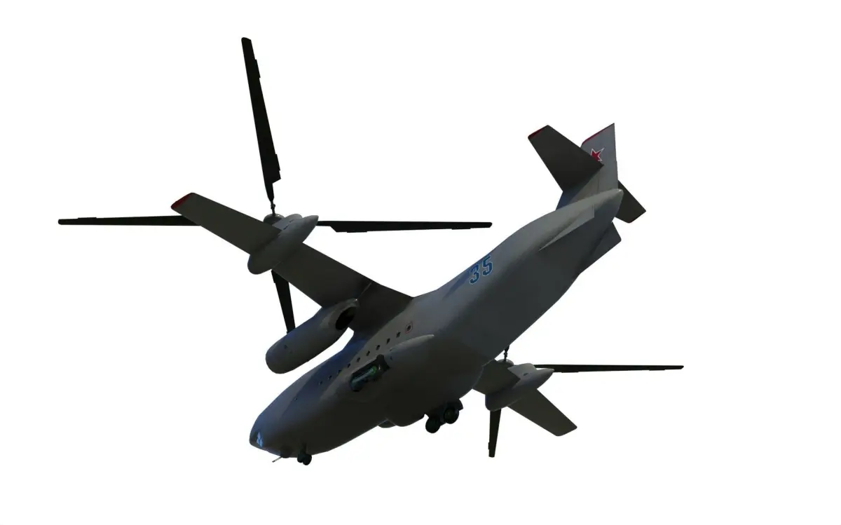 In 1967, the Kamov Design Bureau proposed a project for the Ka-35D transport rotorcraft,intended to work in tandem with the An-12D aircraft. With a takeoff weight of 71.500 kg, it could carryup to 11 tons of cargo for a distance of up to 700 km (maximum - 800 km) with a cruising speed of up to 500 km / h.Its carrying capacity reached 20 tons, and the maximum design speed was 500-550 km / h.On the Ka-35D, two turbojet engines were used with a rotor drive with overlapping disks of rotating blades.The rear cargo hatch ramp was used for loading and unloading equipment.In the nose of the mobile unit there was a remote-controlled cannon.