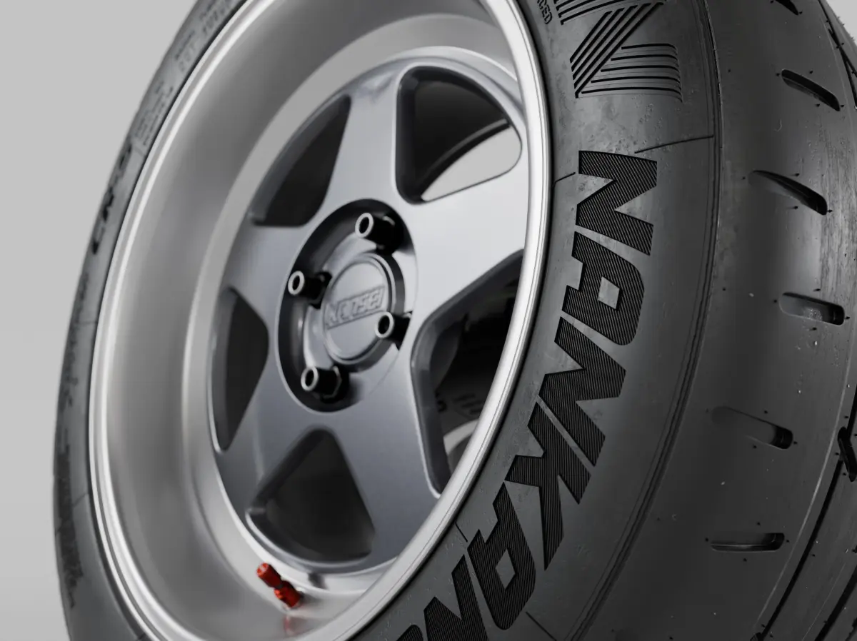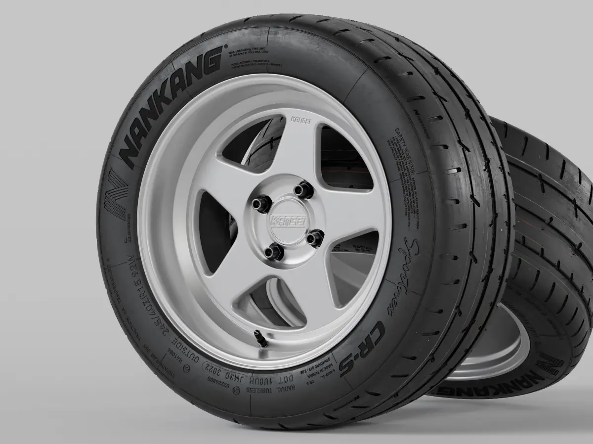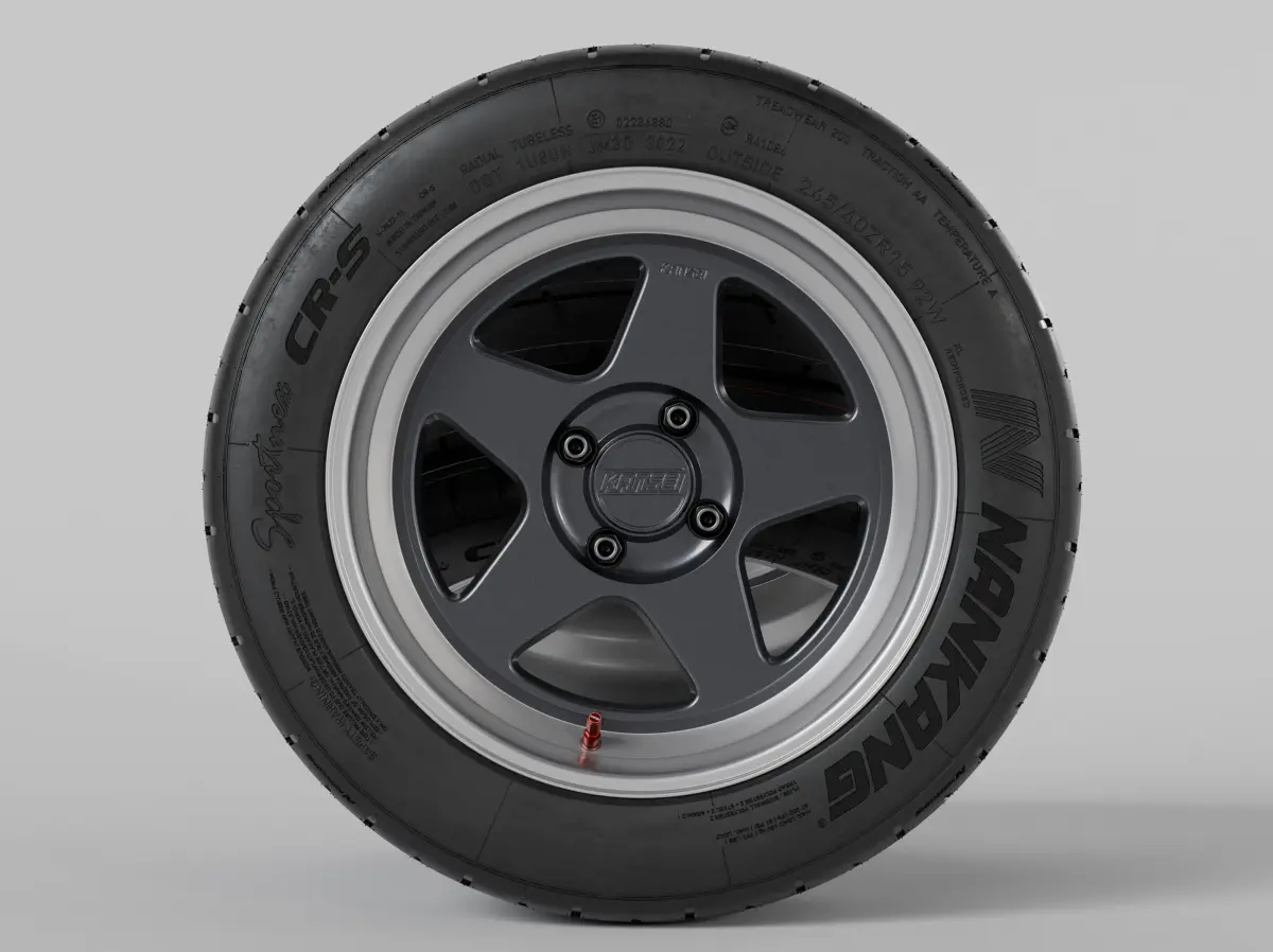 A high-quality model of Japanese Kansei KNP 15" street/sport/racing in two original colour variations rims equipped with high performance Nankang Sportnex CR-S Semi Slick Tires