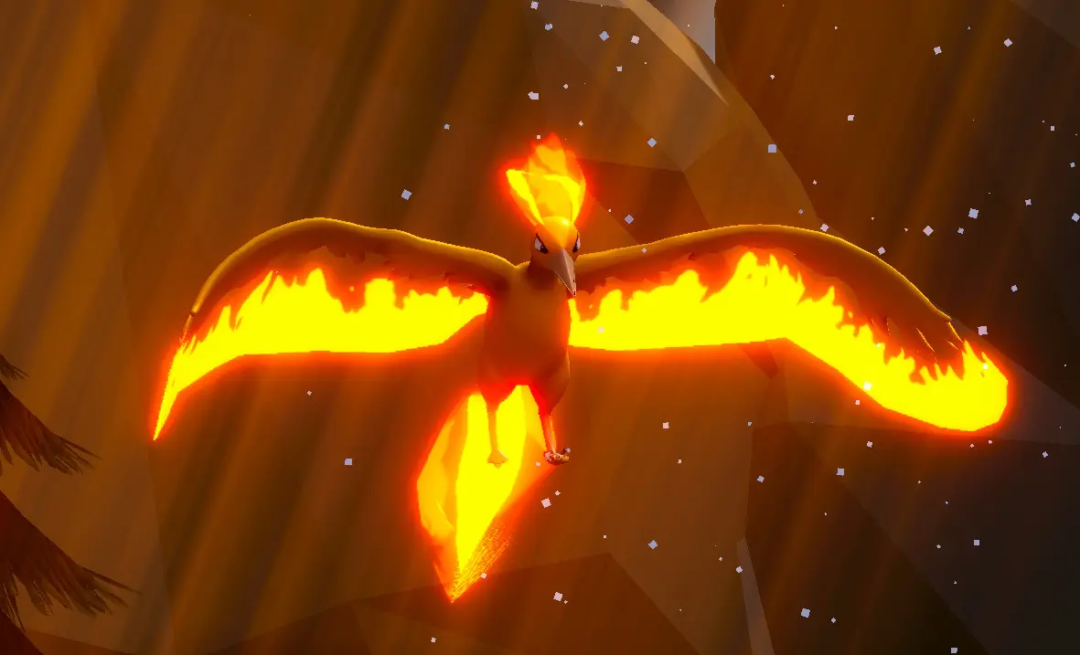 Moltres: The legendary fire bird, featuring dynamic flame effects in its animations.