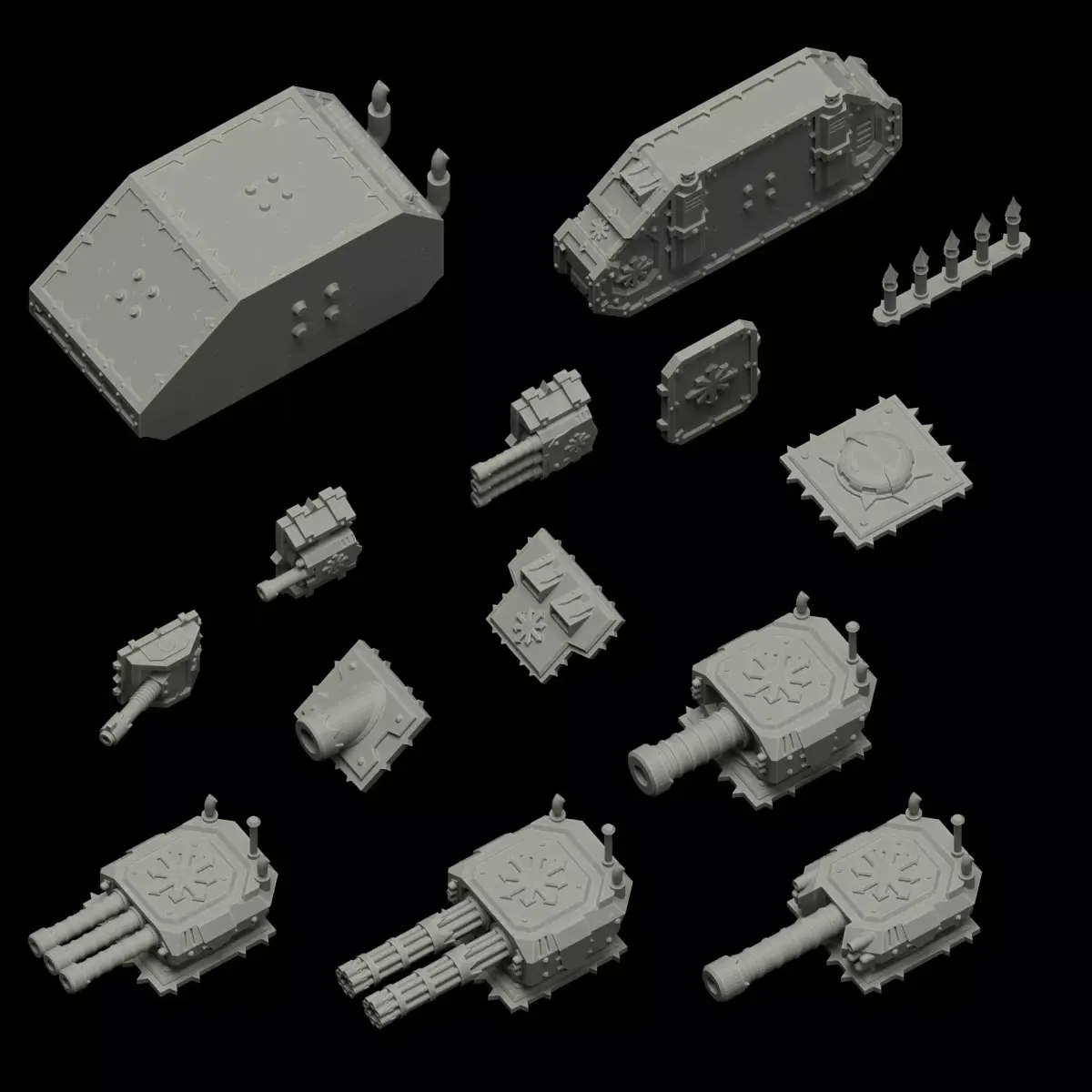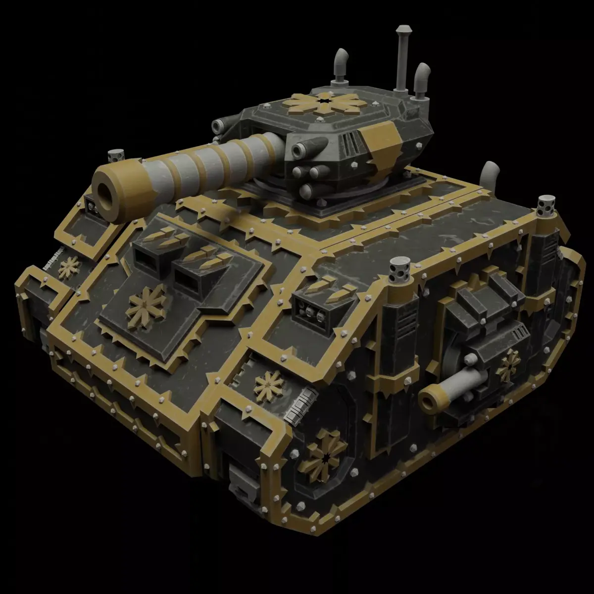 Modular Kaos Tank for your wargaming needs.There are additive cannons and details on the top, front, side of the tracks.