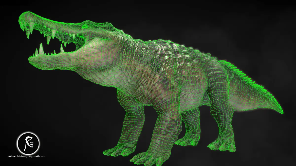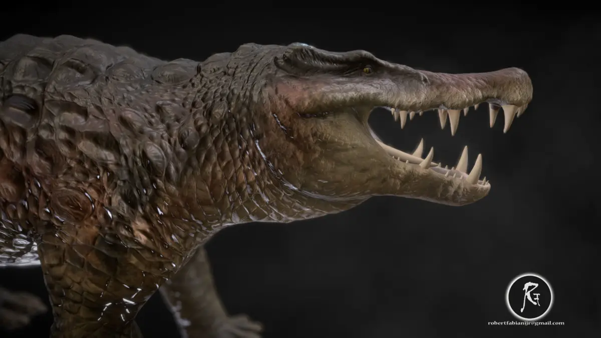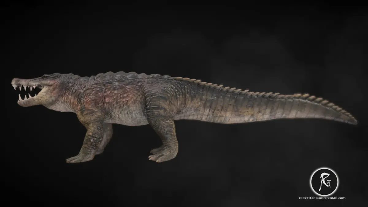 With a body reminiscent of a crocodile, Kaprosuchus boasted a robust build and powerful jaws lined with sharp teeth. Its distinctly elongated snout and large, forward-facing eyes hint at its adaptation for a semi-aquatic lifestyle, reminiscent of modern crocodiles.