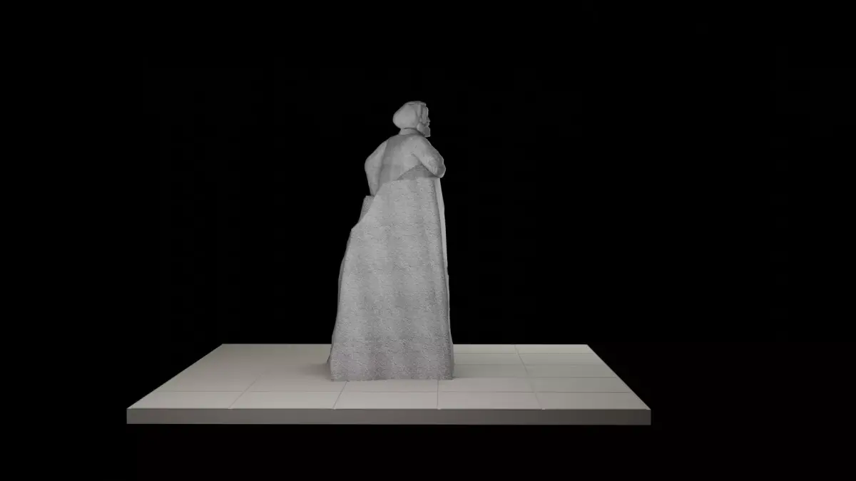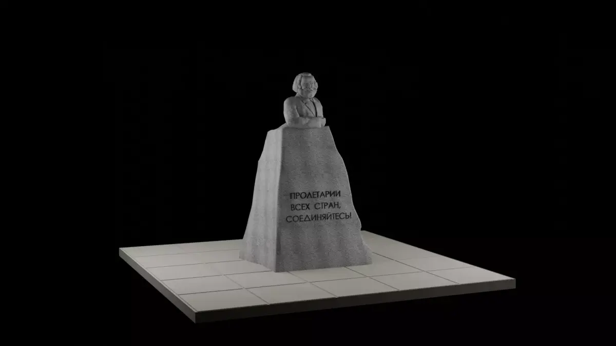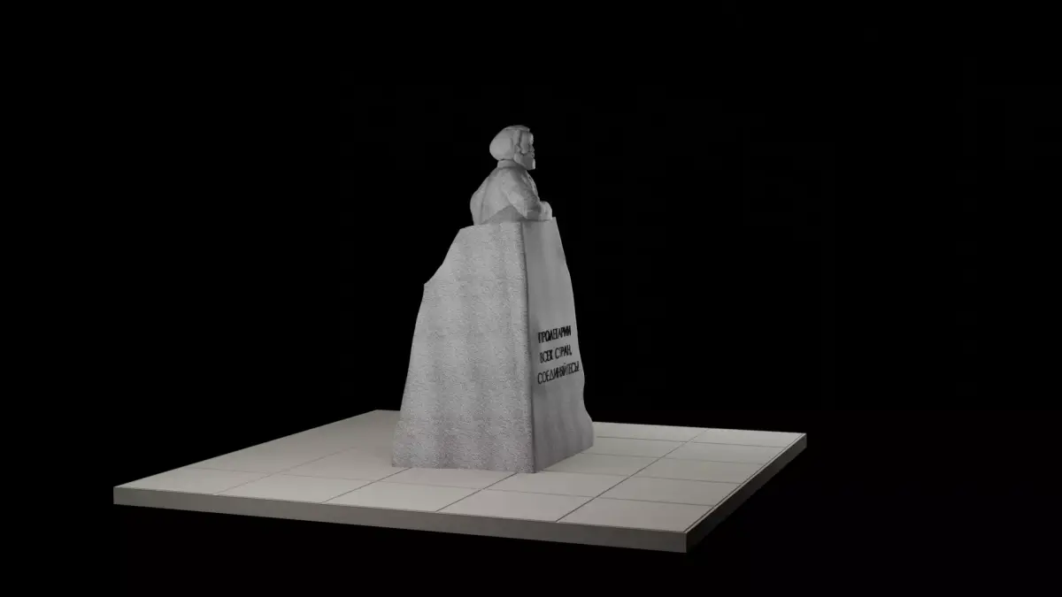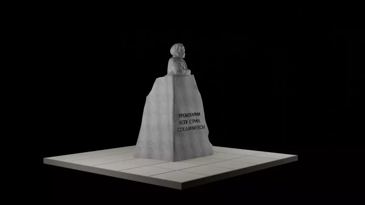 The monument, weighing 160 tons, is made of a monolithic block of gray granite, mined near Dnepropetrovsk (now Dnipro, Ukraine) in the Kudashevsky mine quarry. Marx is depicted as a speaker standing on the podium, as if addressing the working people with a speech. The monument is decorated bearing the motto of the USSR Proletarians of All Countries, Unite! on the front.