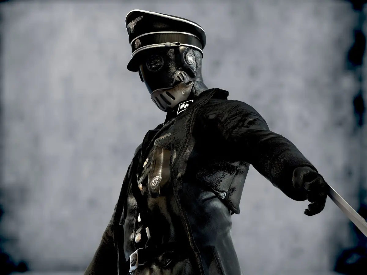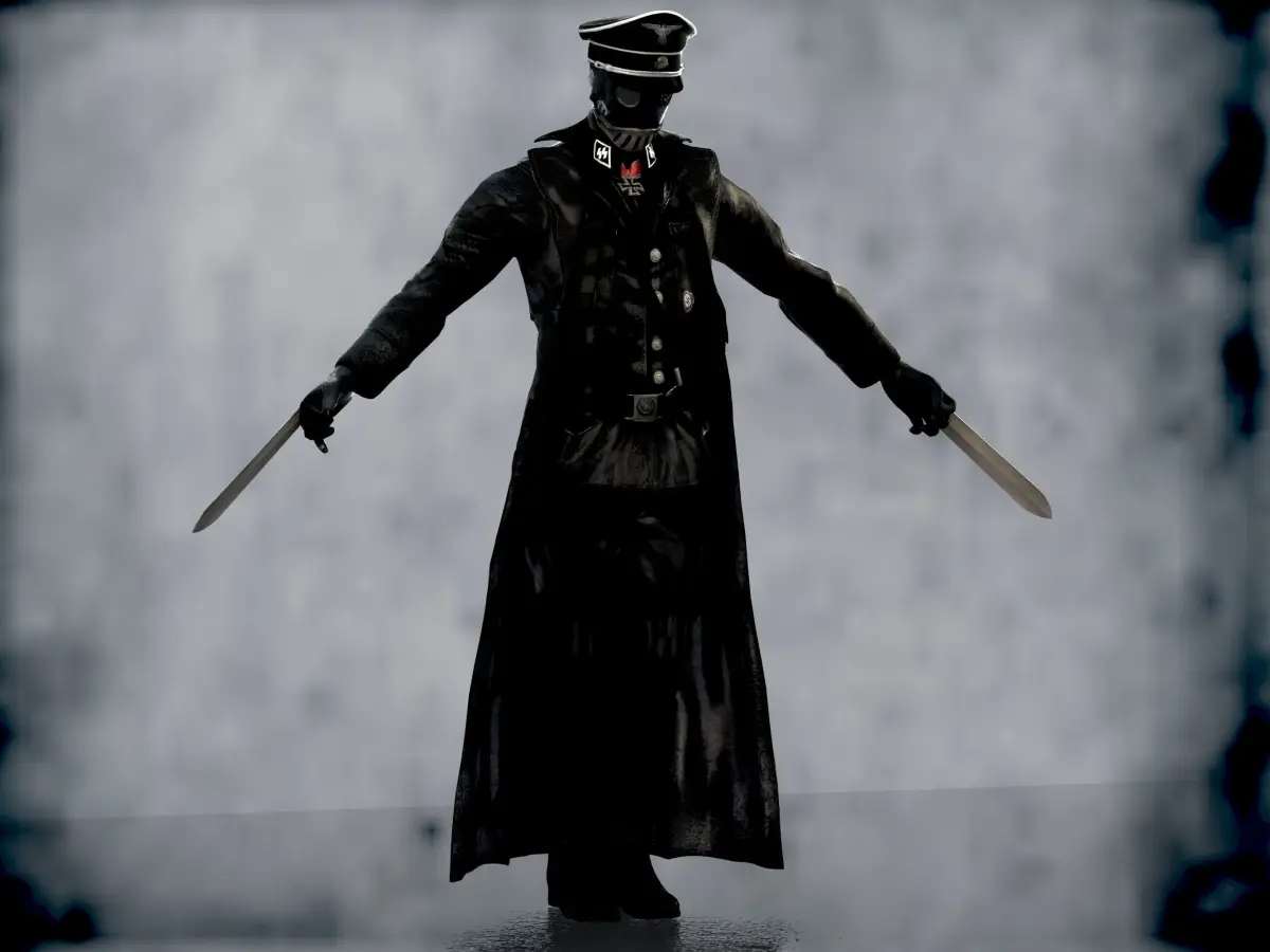 Karl Ruprect Kroenen was a relatively unremarkable Nazi SS scientist, whose most distinguishing characteristic was that he always wore a gas mask and protective bodysuit, possibly due to severe obsessive-compulsive disorder and fear of bacteria. He initially served Grigori Rasputin and his plans to bring about the end of the world. He wields a pair of tonfa blades and also has several other daggers tied to his suit. knives attached to hands can be removed they are made as a separate mesh.