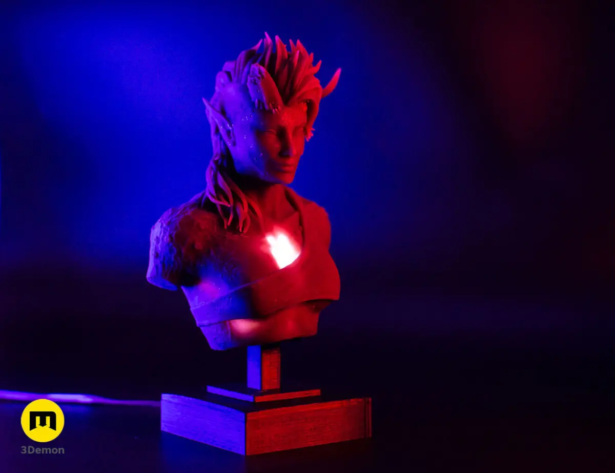 The download includes model pieces (bust+stand) primarily designed for SLA printers. The statue sits on a stand with space for LED light, which can illuminate the heart of Karlach.