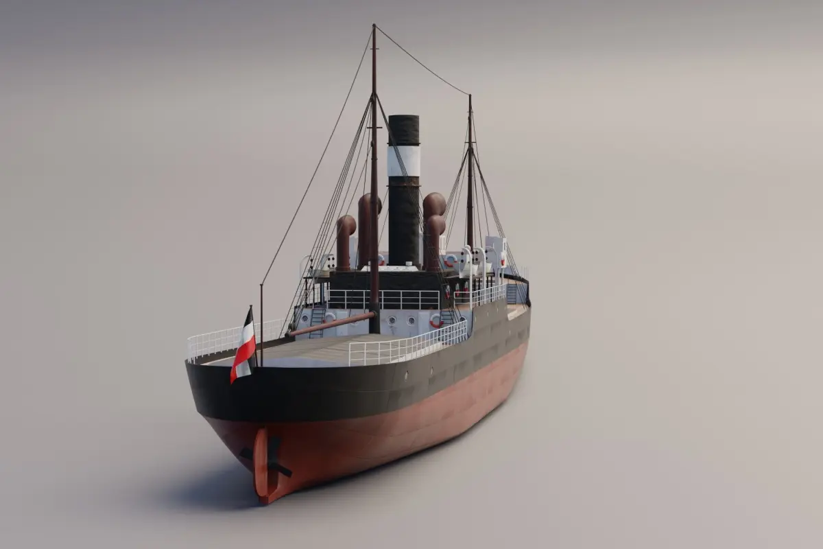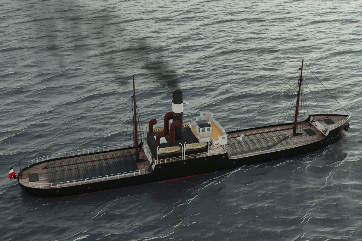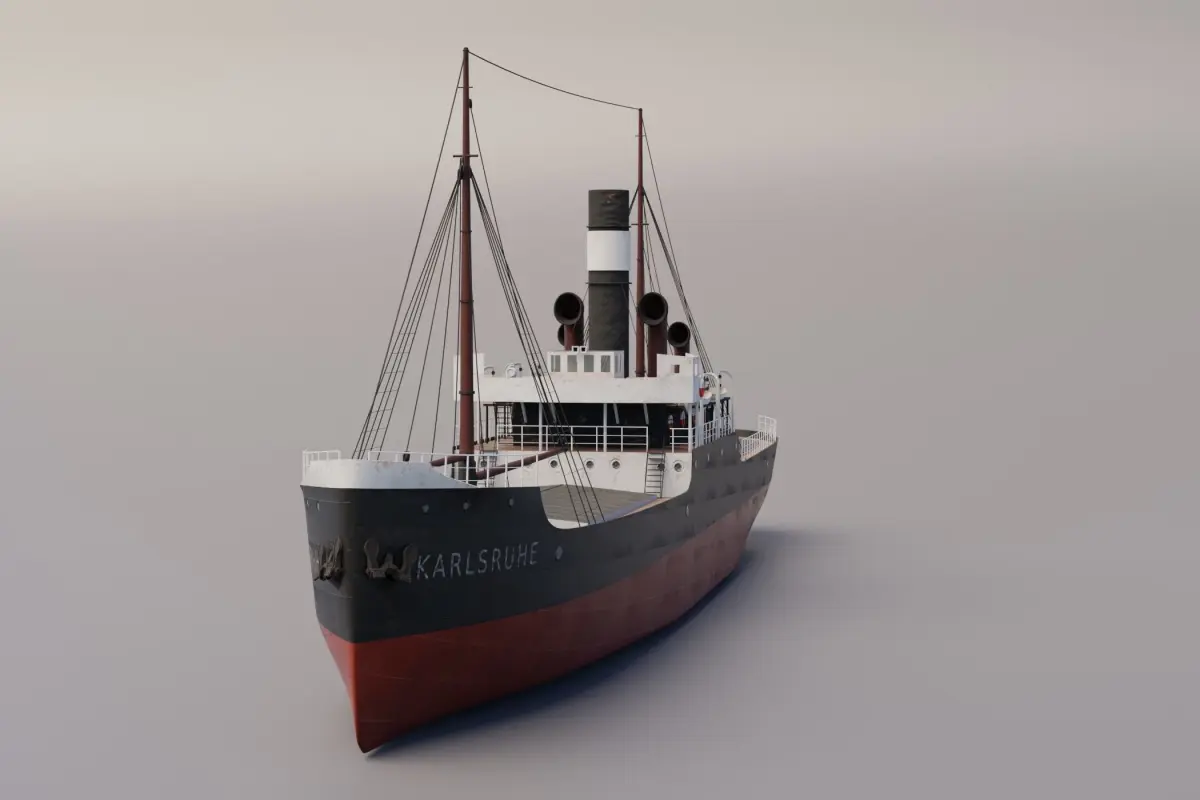 The wreckage of the steamer was found by Polish divers off the coast of the Baltic Sea in 2020. Perhaps there were valuable monuments on board, including the famous Amber Room.More at wikipedia: https://en.wikipedia.org/wiki/SS_Karlsruhe_(1905)The model for the blender includes an ocean simulation, smoke and a flock of gulls :)
