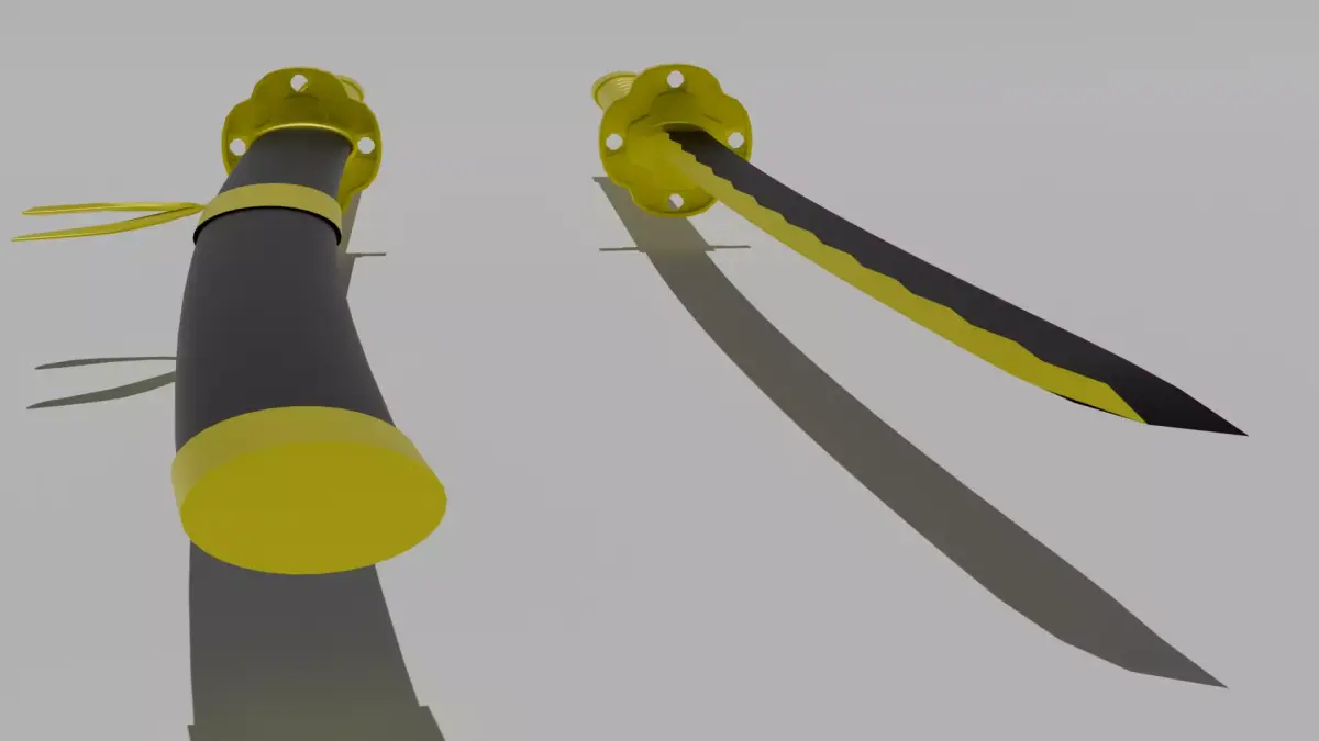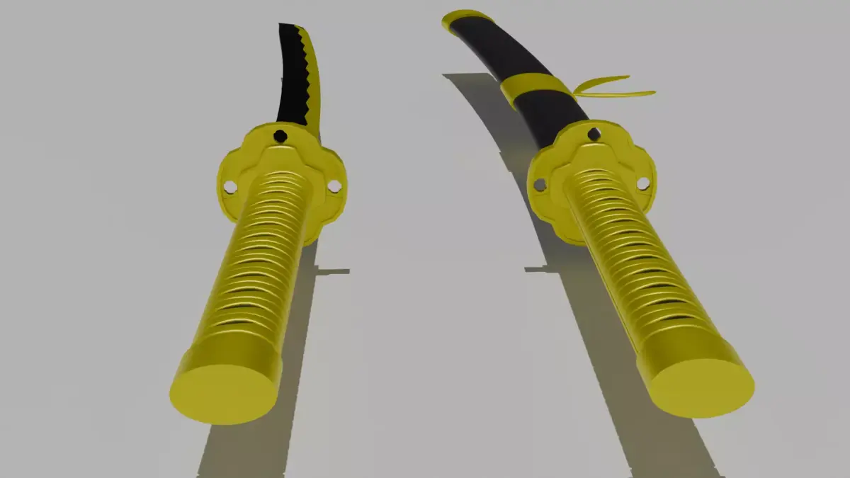 Este modelo 3D representa una katana de diseño elegante y moderno, con un acabado metálico en tonos dorado brillante y negro mate.