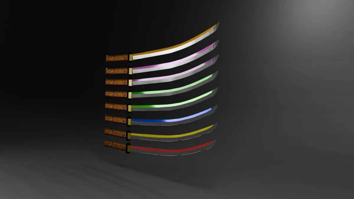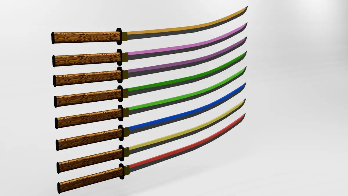 Discover the 3D Katanas collection. This pack contains eight meticulously designed katana models in various colors, such as gold, blue, green, lime, pink, purple, red, and yellow. These katanas not only look stunning but will also add uniqueness to your project, whether it's a game or an animation.