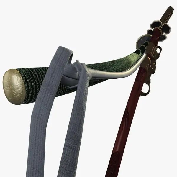 Dual swords, sheathed. All detail is modeled, with textures serving the model. Polys and Nurbs used and grouped. File contains scene, lights, and textures which creates the end result seen in preview images.