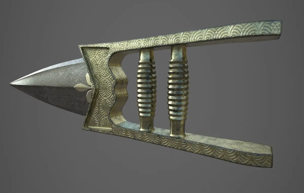 The katar or katara is a type of push dagger from the Indian subcontinent. The weapon is characterized by its H-shaped horizontal hand grip, which results in the blade sitting above the user's knuckles. Unique to the Indian subcontinent, it is the most famous and characteristic of Indian daggersnot suitable for 3D printing.