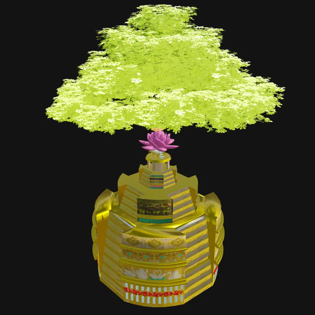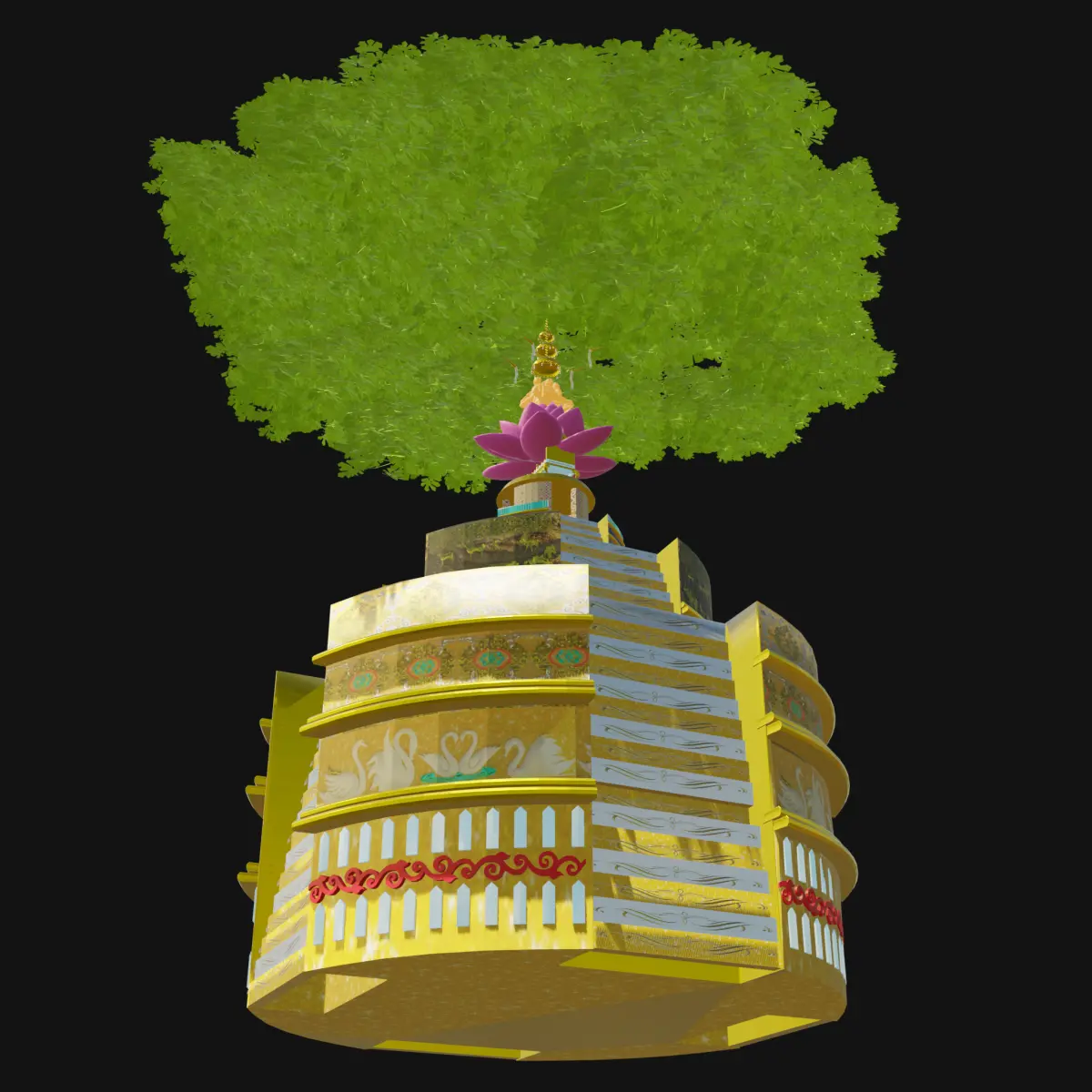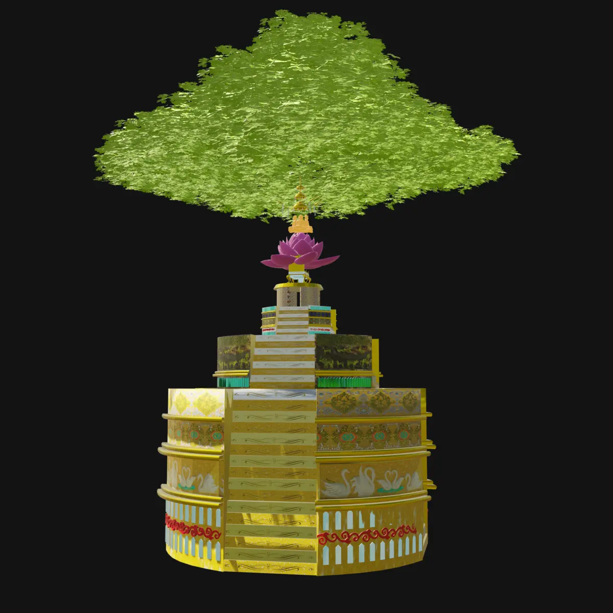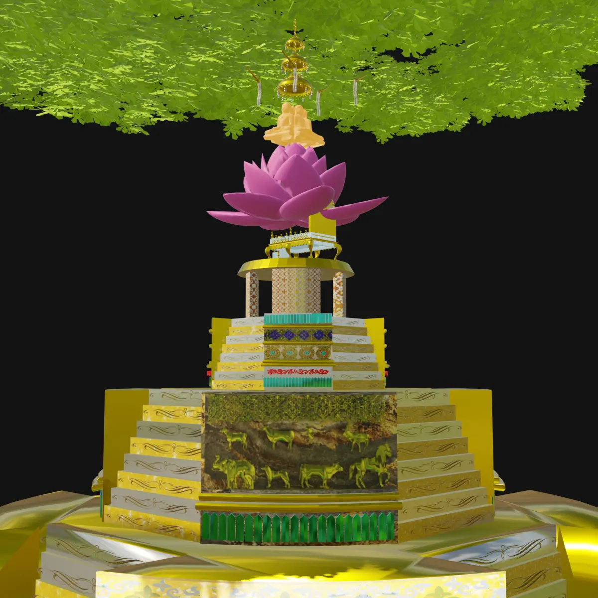 This is a highly detailed and artistically rich 3D model of a Katni (temple monument or sacred pedestal), featuring intricate carvings, religious symbolism, and a stylized sacred tree emerging from the top. The model is ideal for use in cultural visualizations, spiritual architecture projects, historical recreations, animations, and game environments.