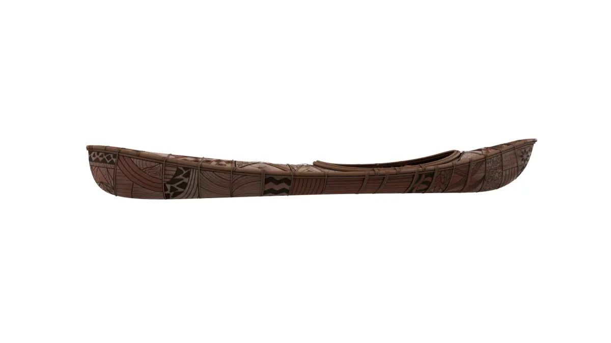 A sleek and streamlined kayak made of woven reeds and animal hide, featuring intricate geometric patterns in earthy tones, showcasing the traditional design of watercraft used by early settlers in historical times.