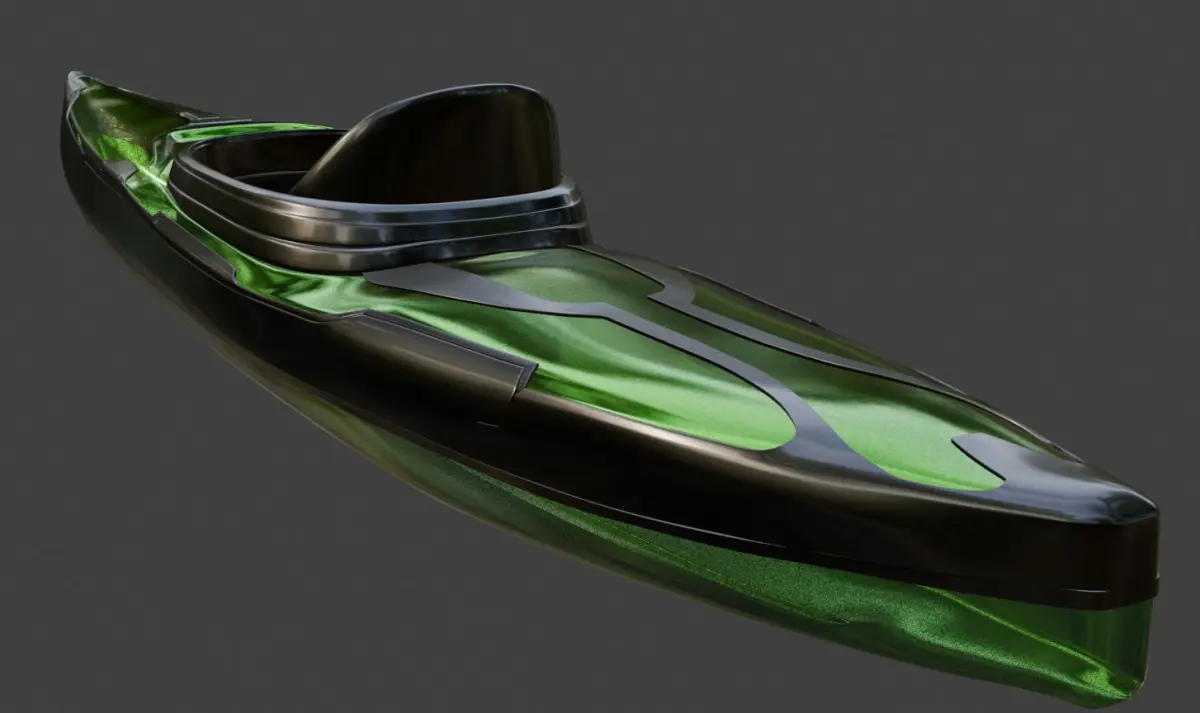 A sleek and futuristic recreational kayak in a vibrant neon green color, with a smooth and shiny metallic finish. The kayak features a streamlined shape with angular edges and a translucent cockpit, giving it a modern and cutting-edge look perfect for cruising on the water in the future.