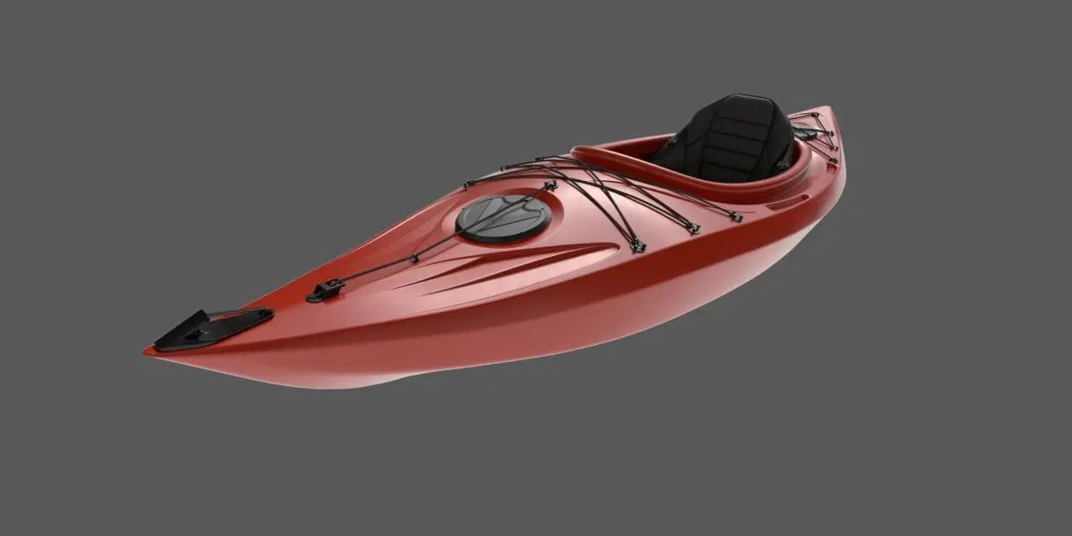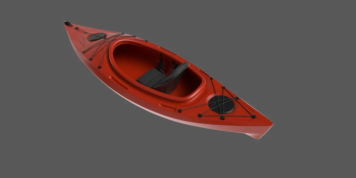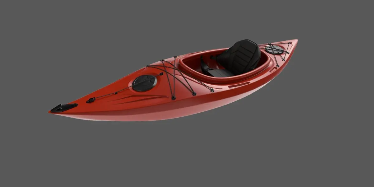 A sleek whitewater kayak with a vibrant red color, designed for swift maneuvering through turbulent waters. The kayak is made of durable plastic material, with black padded seats for comfort during long adventures on the river. The angular shape of the kayak allows for easy control and stability in rough currents.