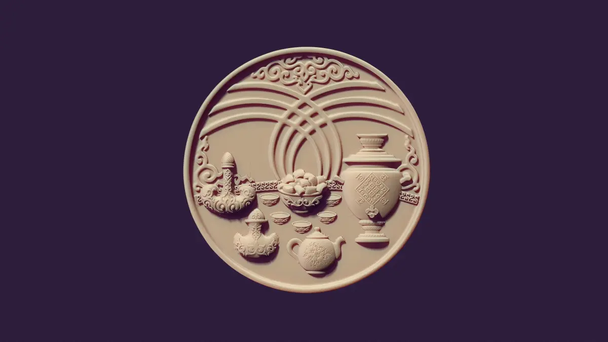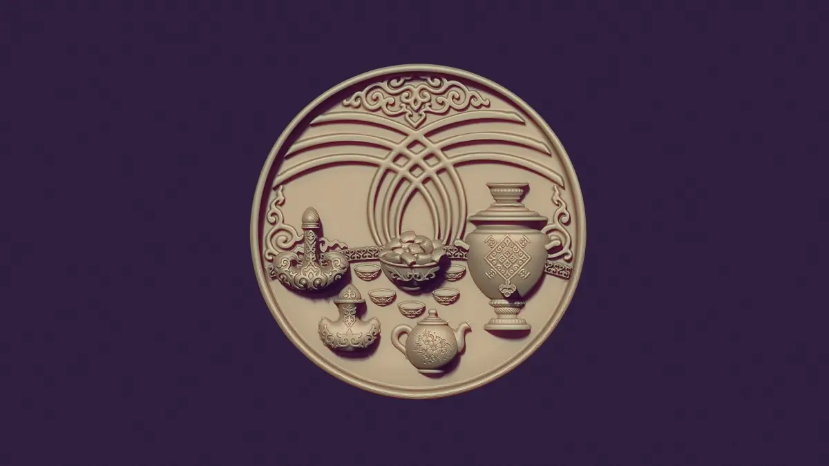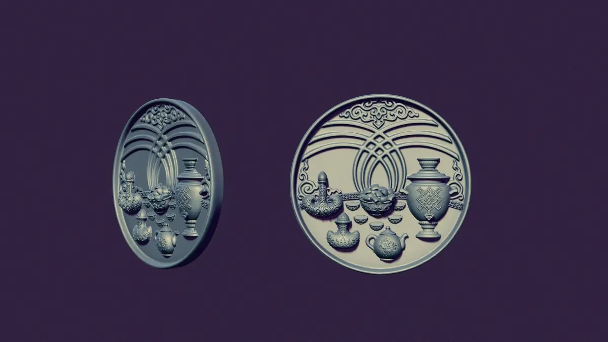 The decoration of the plate is a panel with the image of a Kazakh dastarkhan the diameter is 140mm, the thickness of the base is 6 mm, the thickness of the patterns with objects is 2-10mm