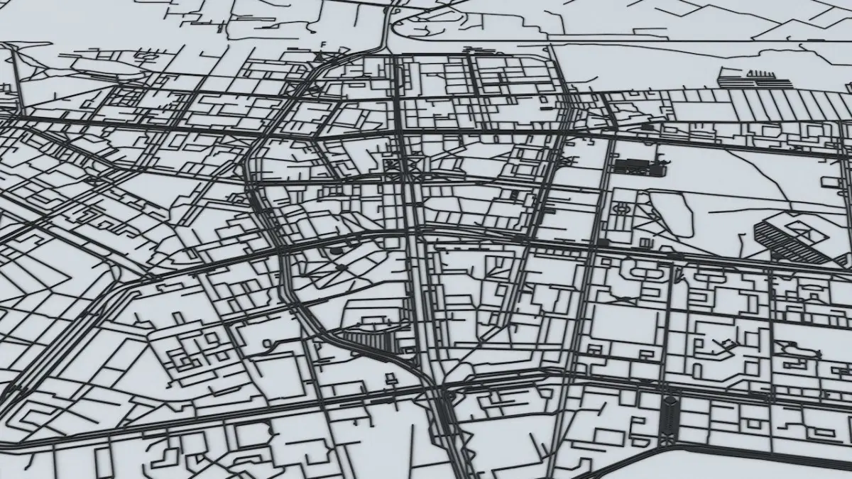 - the model is positioned on a flat surface (road network is on the “floor” - no elevation data included)
