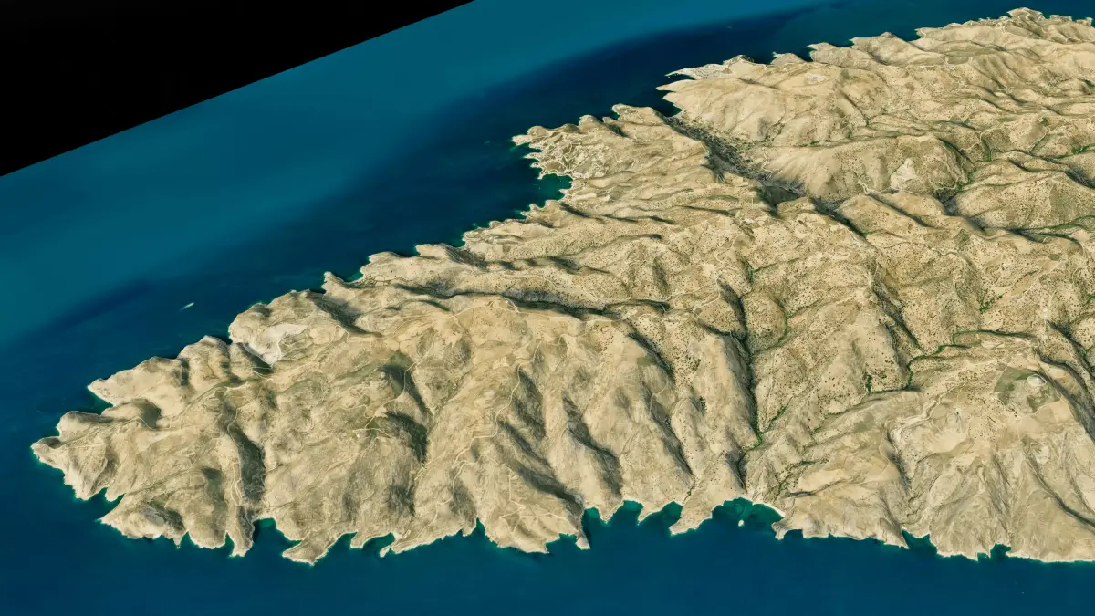 Kea Island 3D model terrain. 3d model island of Kea, Greece with its landscape of mountains, beaches and forests.