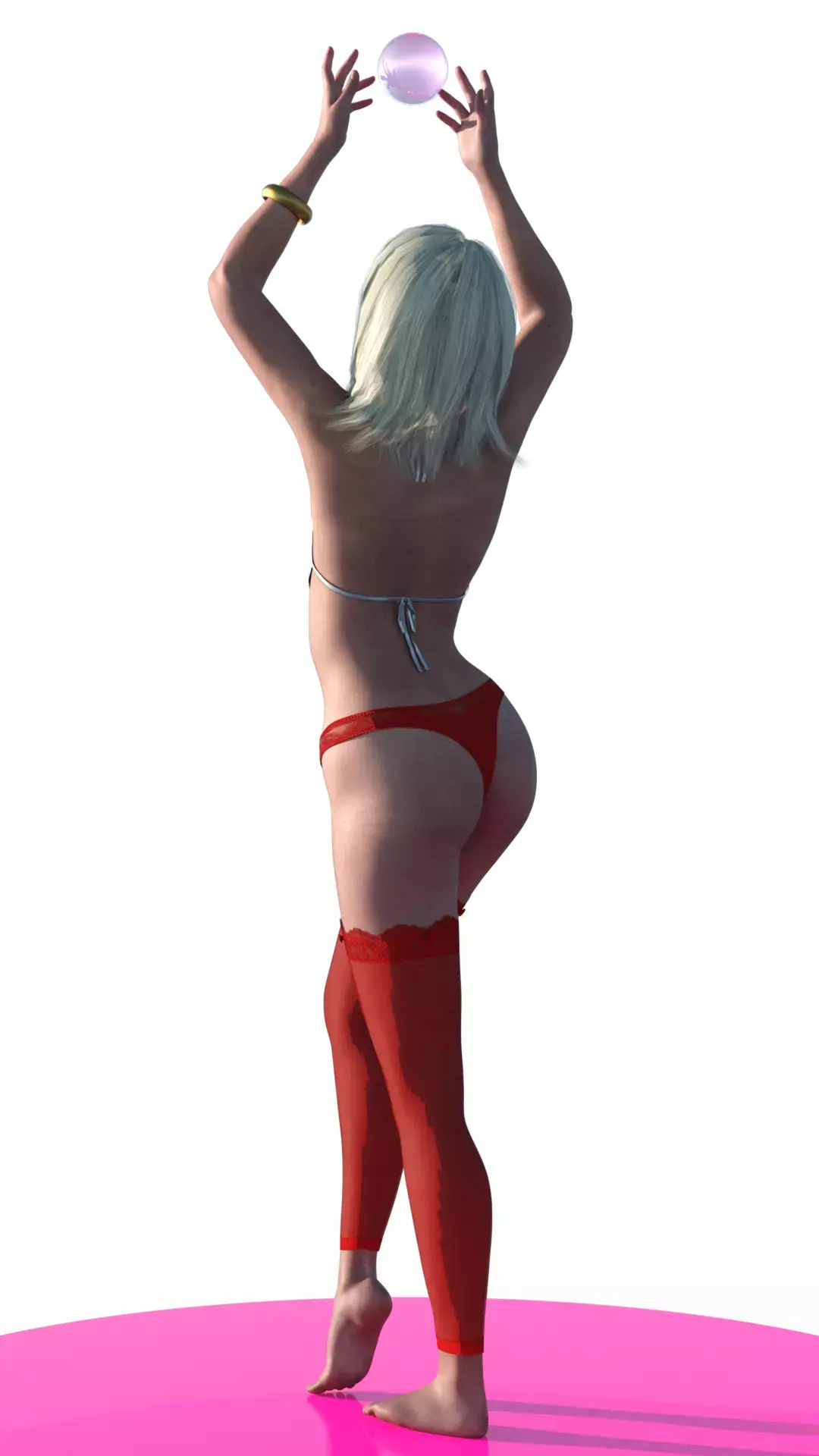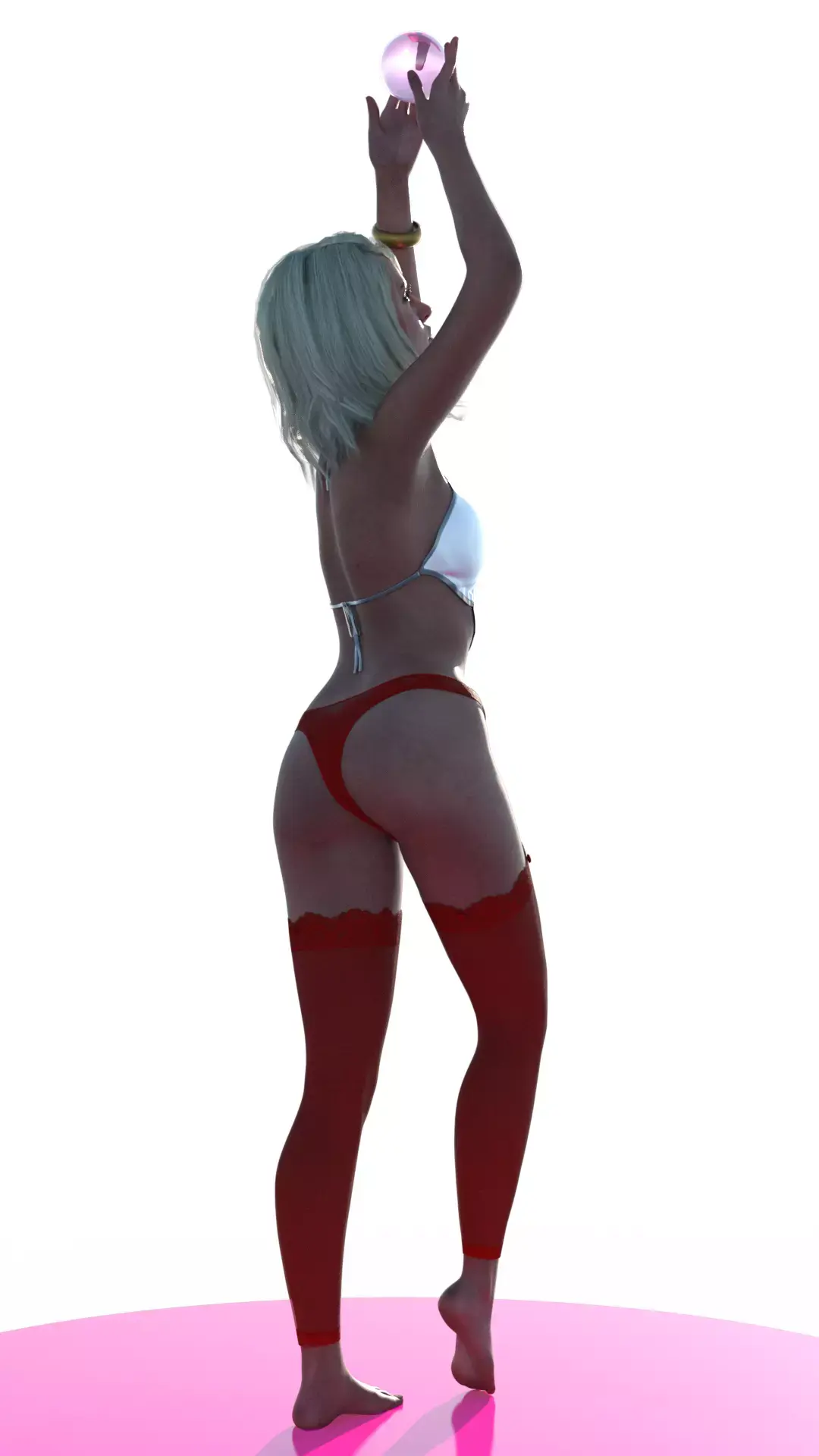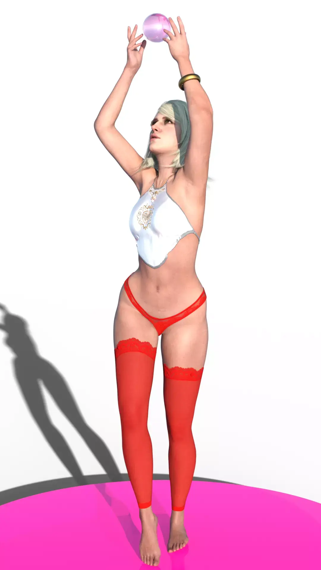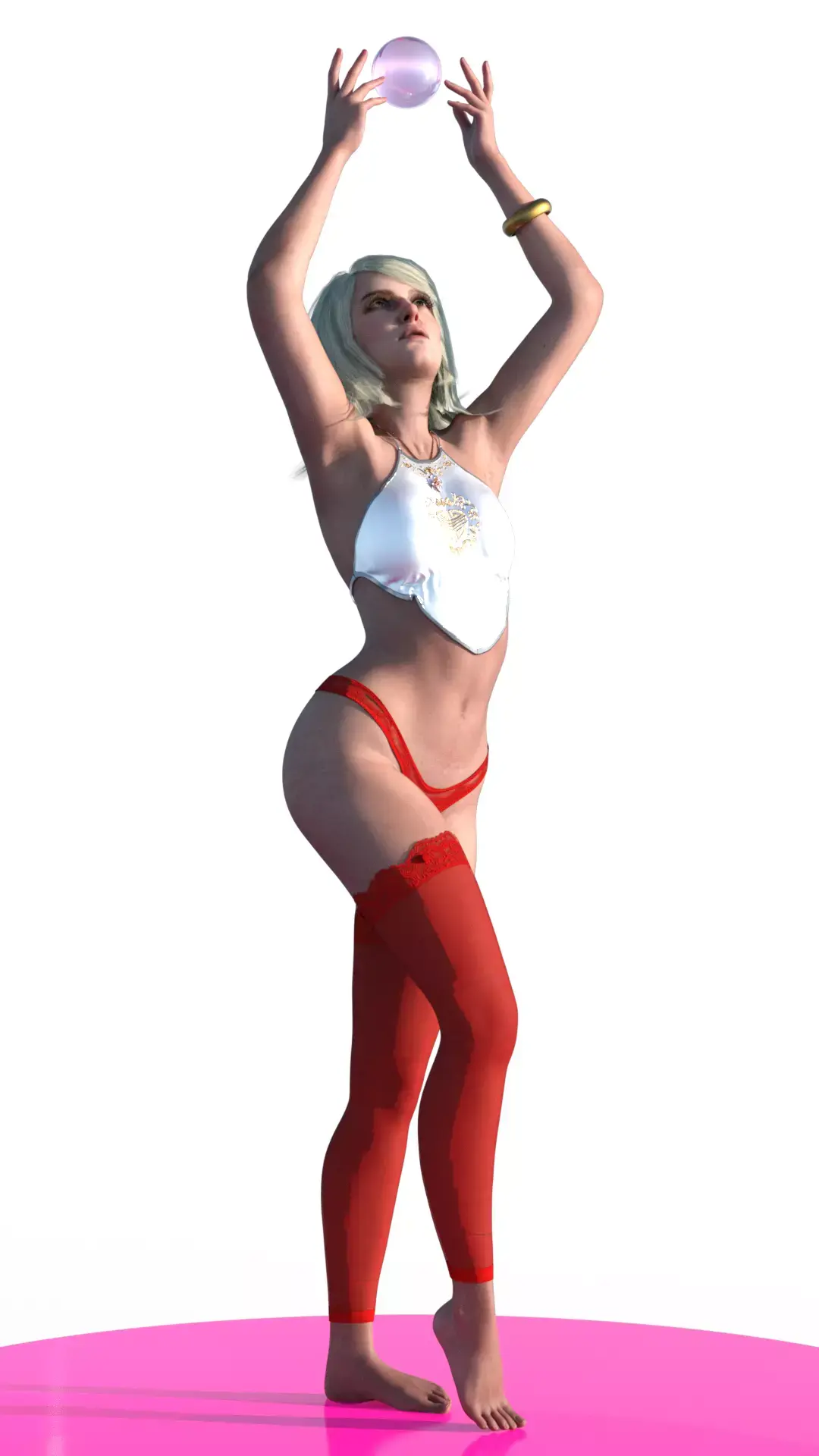 Top: A white satin or silk halter top, featuring a gold decorative design at the center of the chest.Bottom: High-cut red underwear and sheer red thigh-high stockings with a lace trim at the top.Accessories: A gold cuff bracelet on her right arm and a delicate necklace.The character holds a glowing sphere (possibly a magic orb or light bubble) of a pink-purple hue above her head, suggesting an act of conjuring or a magical dance. She stands barefoot on a glossy, bright pink circular platform, with a black background that isolates the figure and emphasizes the vibrant color palette (red, white, and pink).