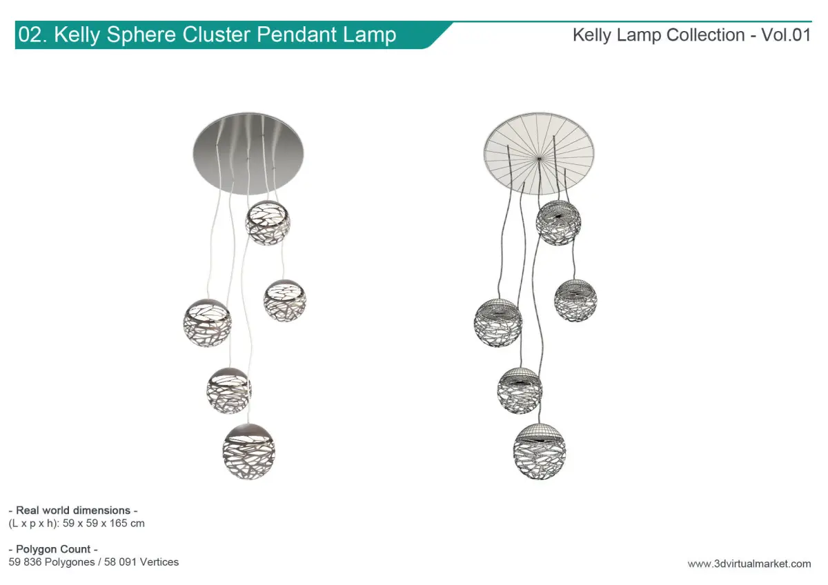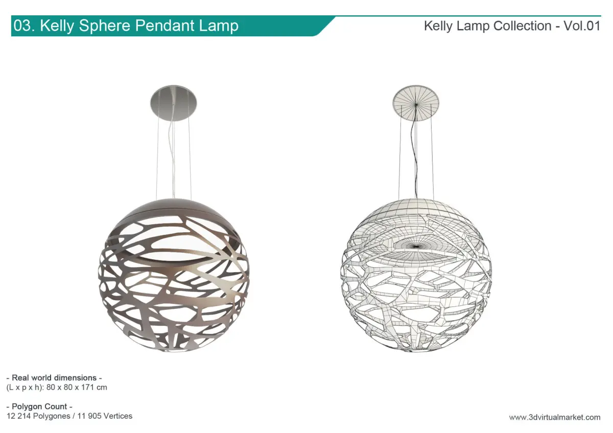 3/. Kelly Sphere Pendant Lamp : L.80 x H.171 x P.80 cms. / 12 214 polygons and 11 905 vertices.