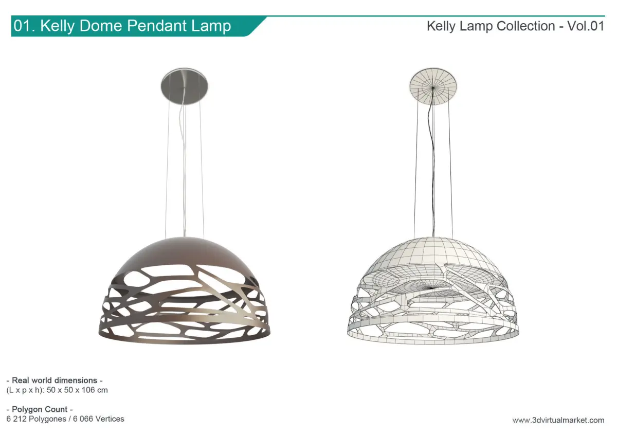 1/. Kelly Dome Pendant Lamp : L.50 x H.106 x P.50 cms. / 6 212 polygons and 6 066 vertices.