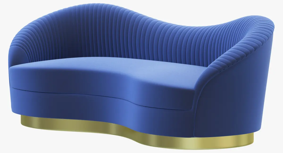 The lux and bodacious Kelly sofa is the cool girl sipping Cosmos in the dark corner of a chic NYC lounge. Her fluid curves are harmoniously matched by sumptuous pleated waves of deep blue velvet upholstery. Her tell is a striking polished brass band hugging the base of her curvaceous body, leaving you constantly searching for a golden glimpse of her copious beauty.